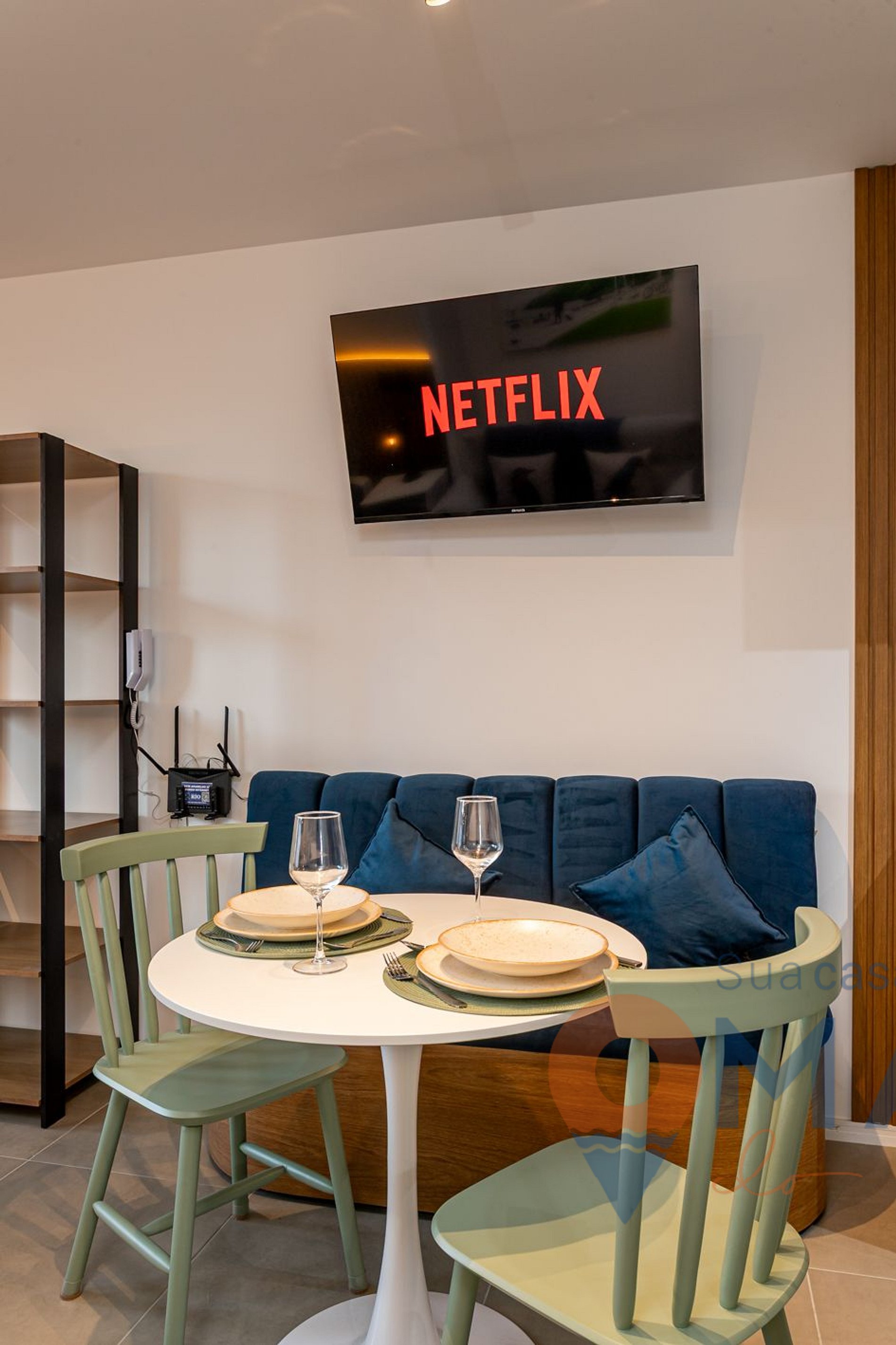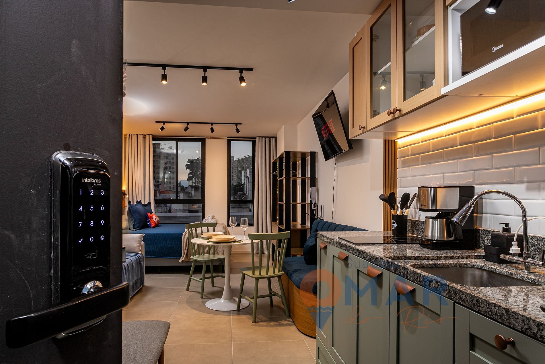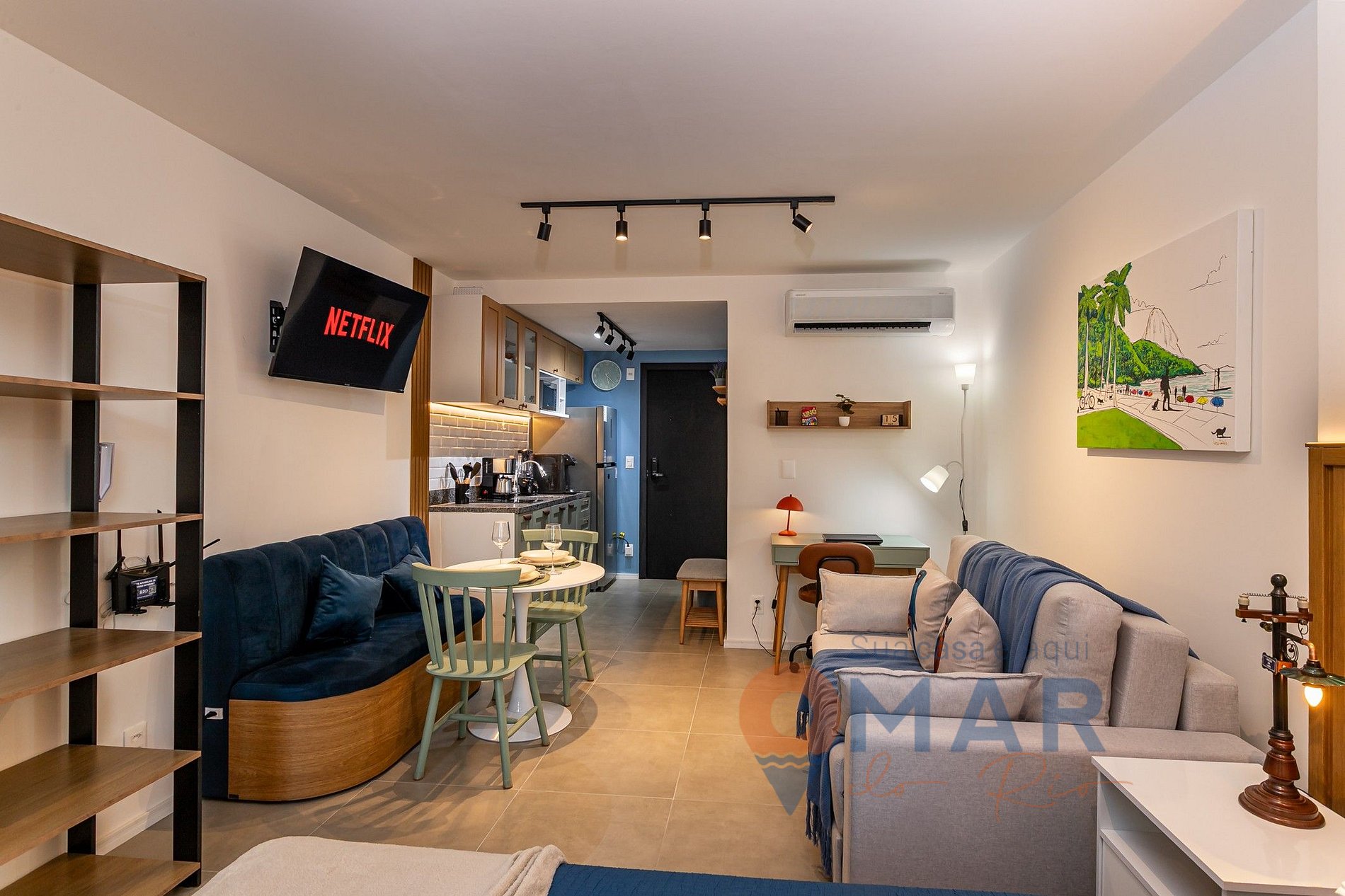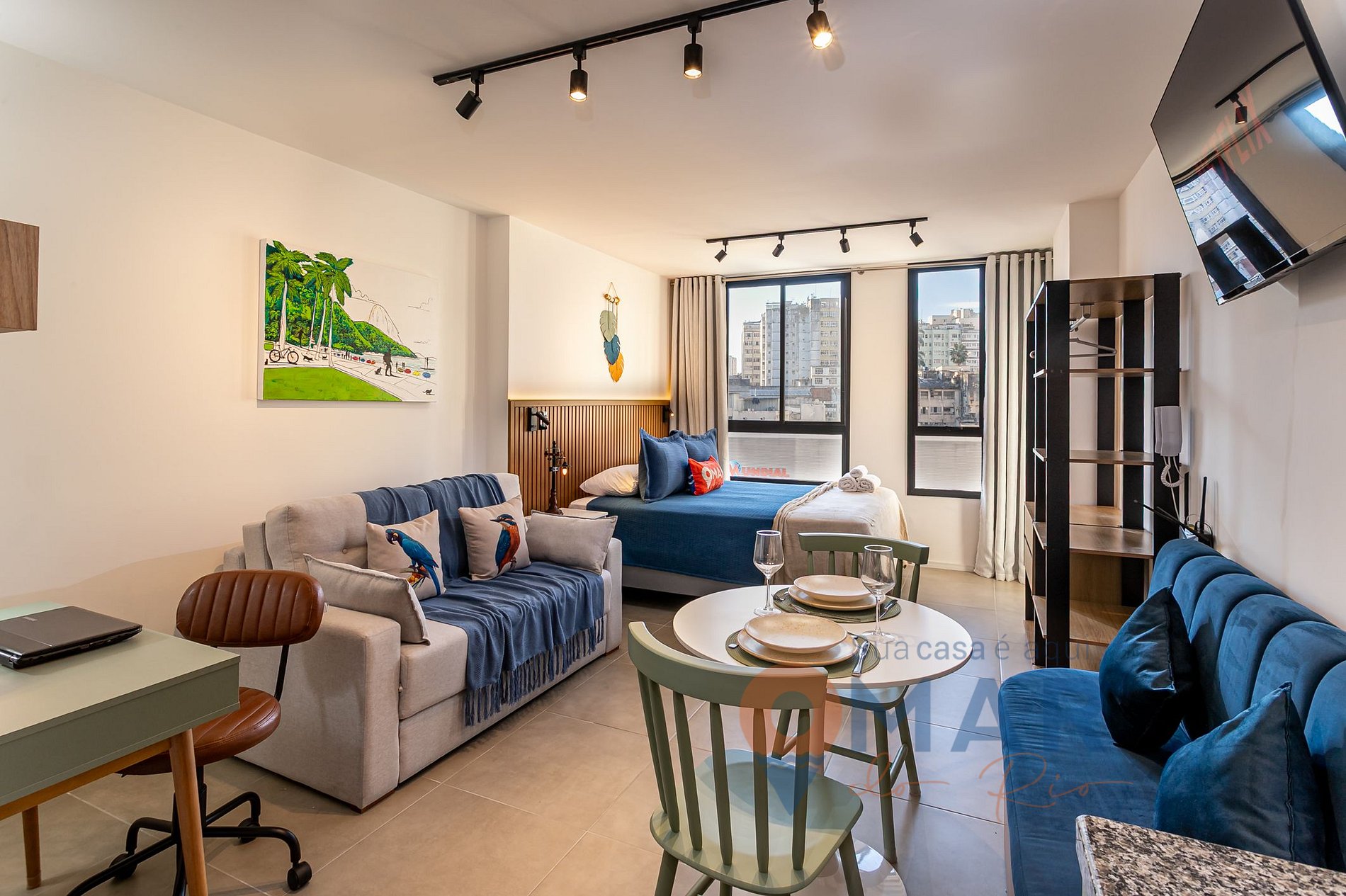 Estúdio: cama queen size (198cm x 158cm), sofá - cama (188cm x 130cm), smart TV 43" com canais abertos (antena digital), ar-condicionado split, cortina semi-blackout, armário aberto com cabides, espaço de trabalho, espelho de corpo inteiro e mesa de jantar com assentos.
