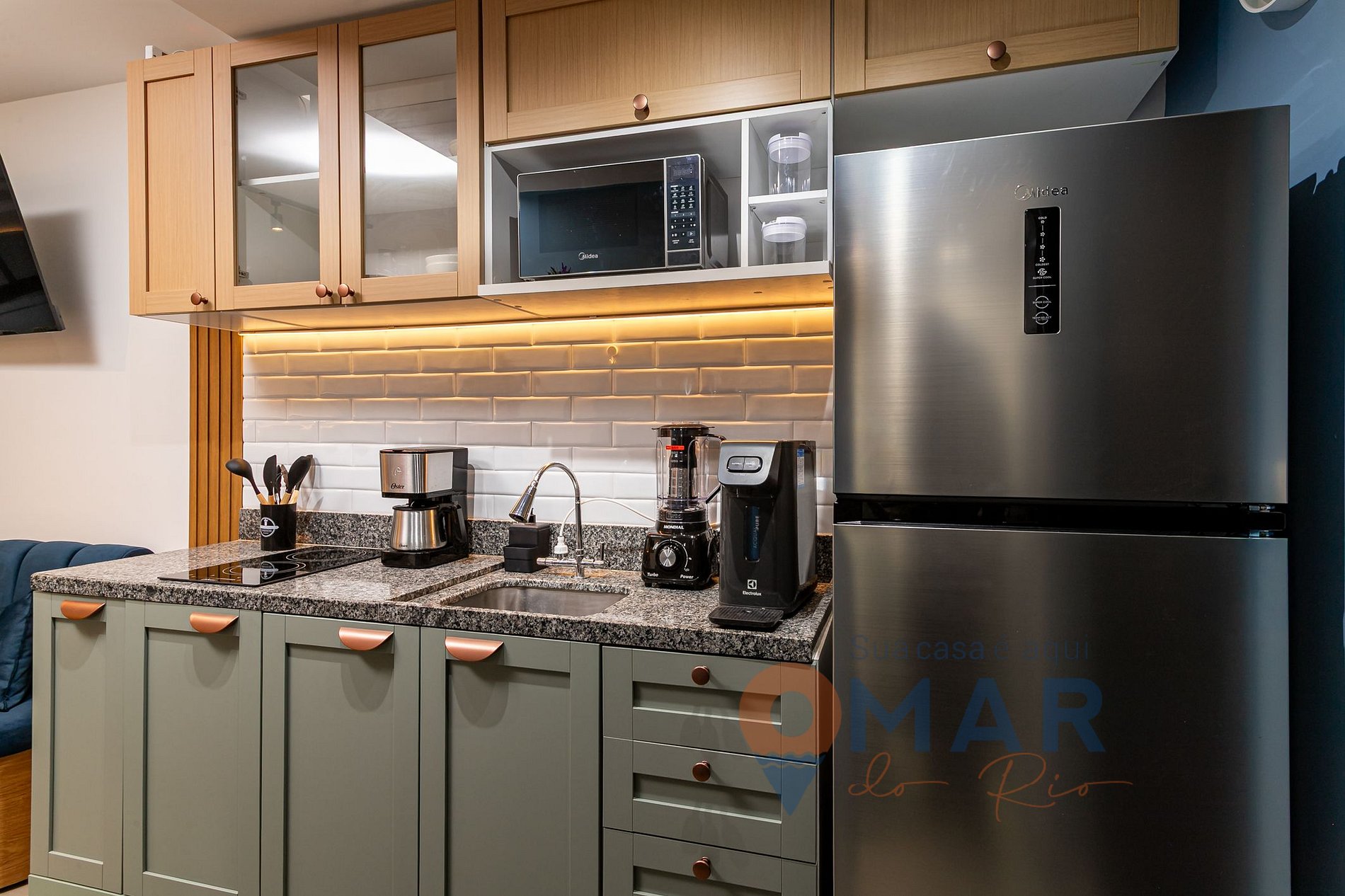 Cozinha: geladeira, fogão cooktop 2 bocas, micro-ondas, cafeteira elétrica, chaleira elétrica, pipoqueira, sanduicheira, liquidificador e utensílios para cozinhar.