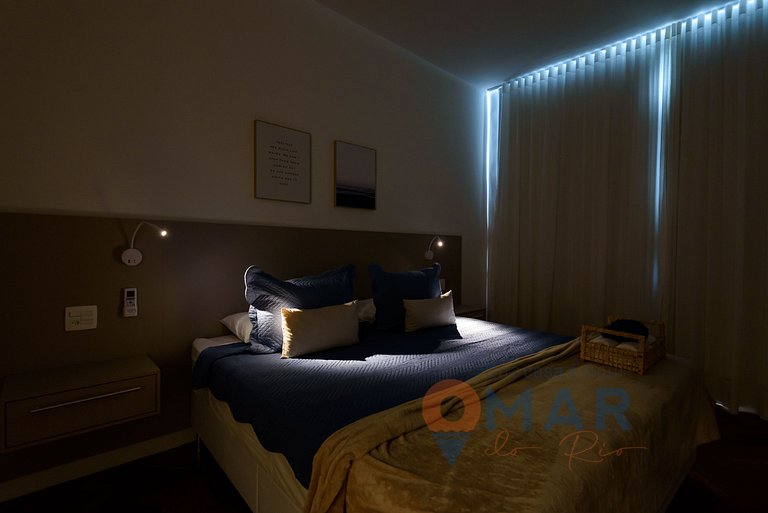 Suíte: Cama King Size, ar condicionado split, Smart TV, armário, cortina blackout.