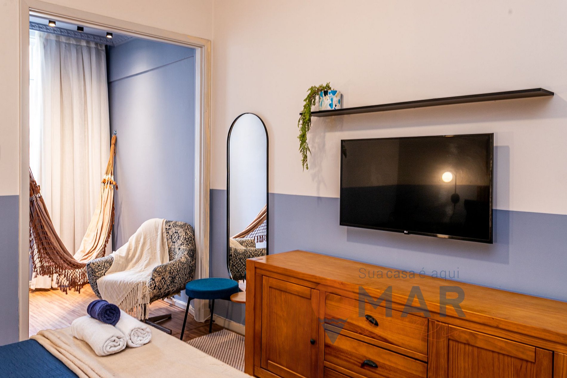 Quarto 1: cama Queen Size (198cm x 158cm), ar-condicionado, Smart TV, workstation, poltrona, arara aberta, ventilador de teto, espelho, rede e cortina blackout.