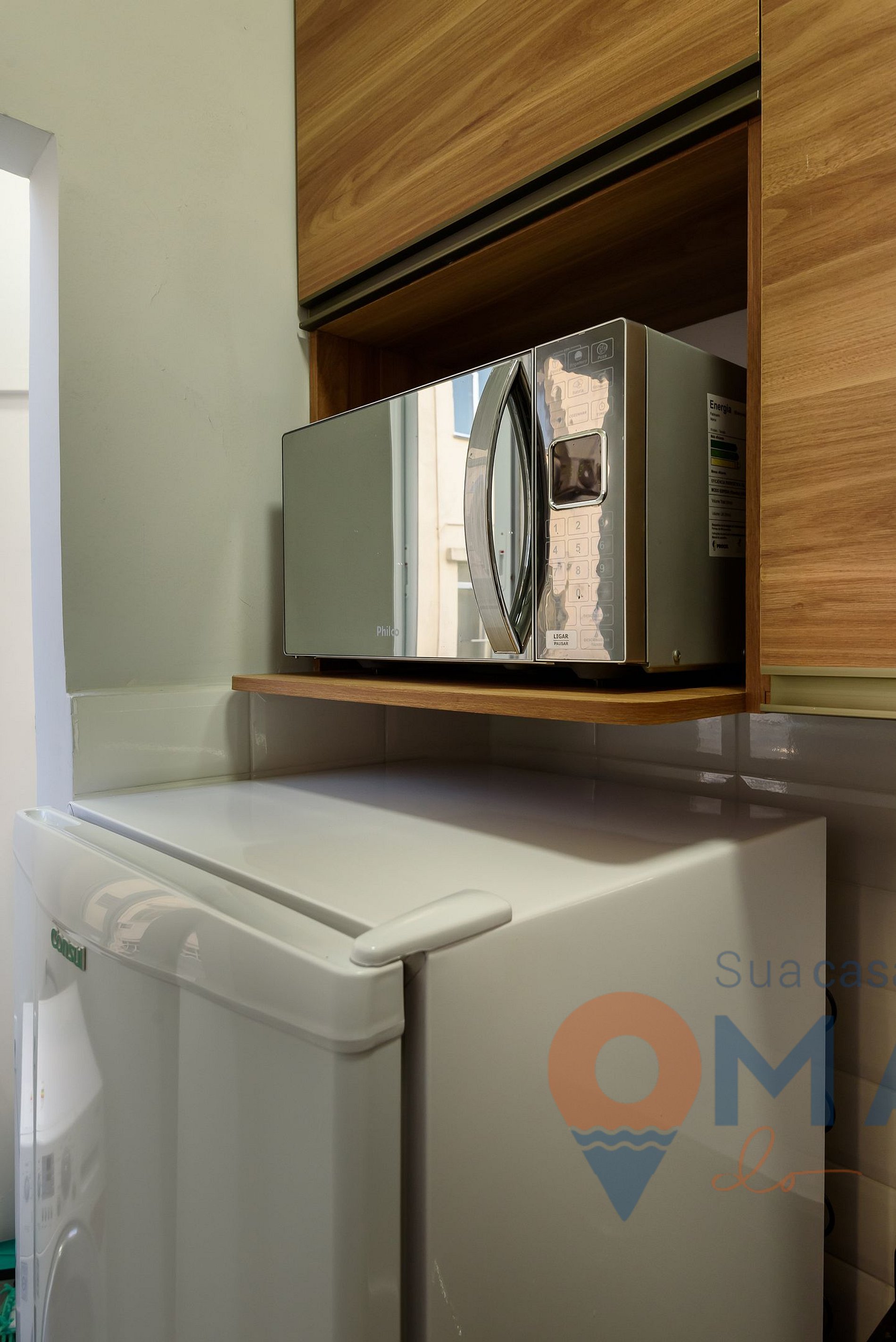 Cozinha: geladeira, cooktop 2 bocas com acendimento automático, micro-ondas, cafeteira comum, liquidificador, sanduicheira, purificador de água diretamente na torneira (alavanca do lado esquerdo - água filtrada) e utensílios para cozinhar.