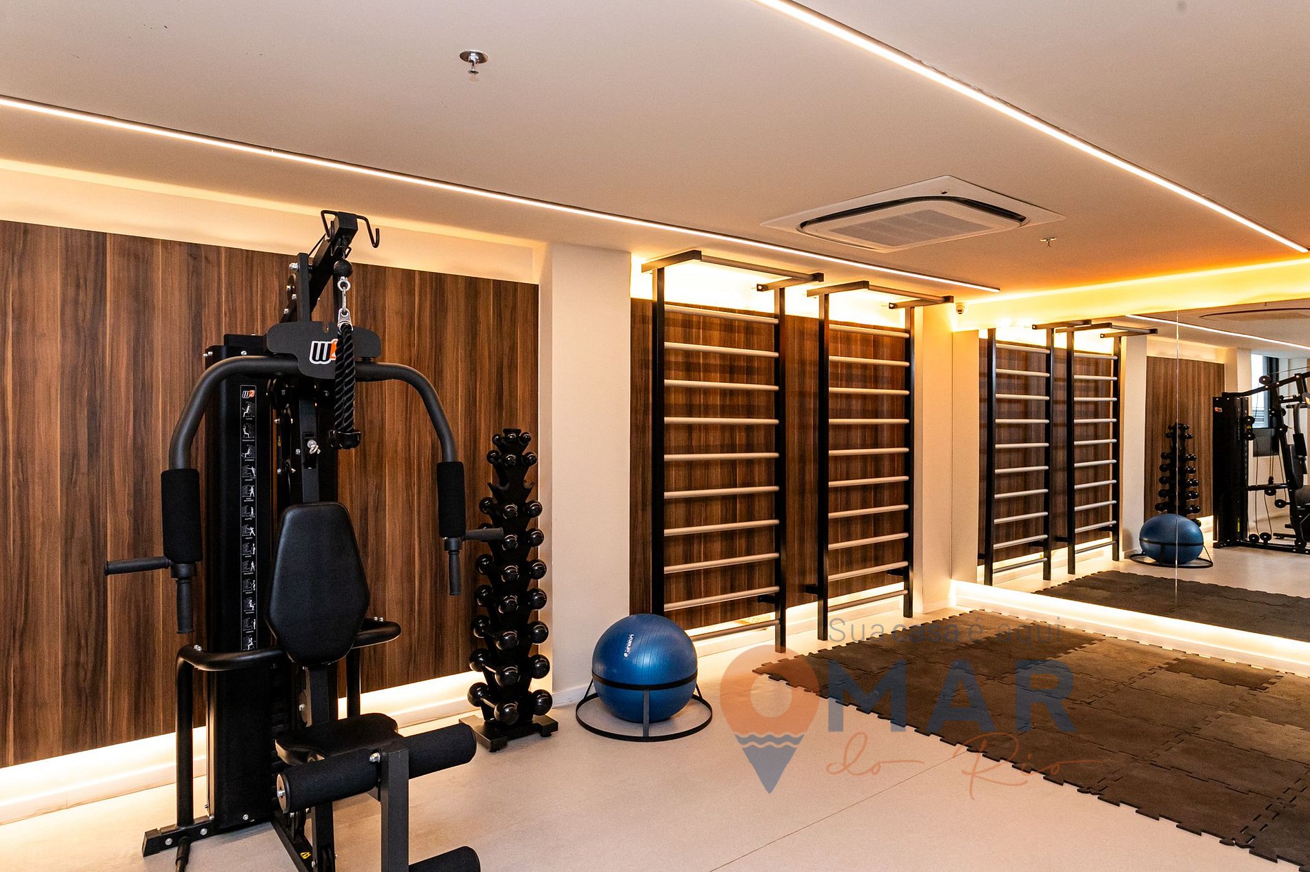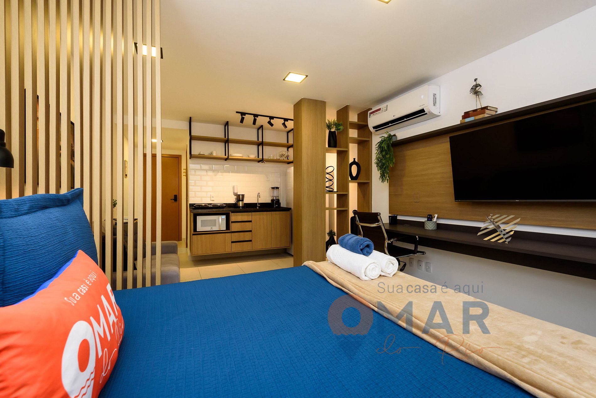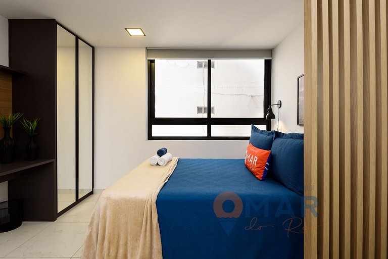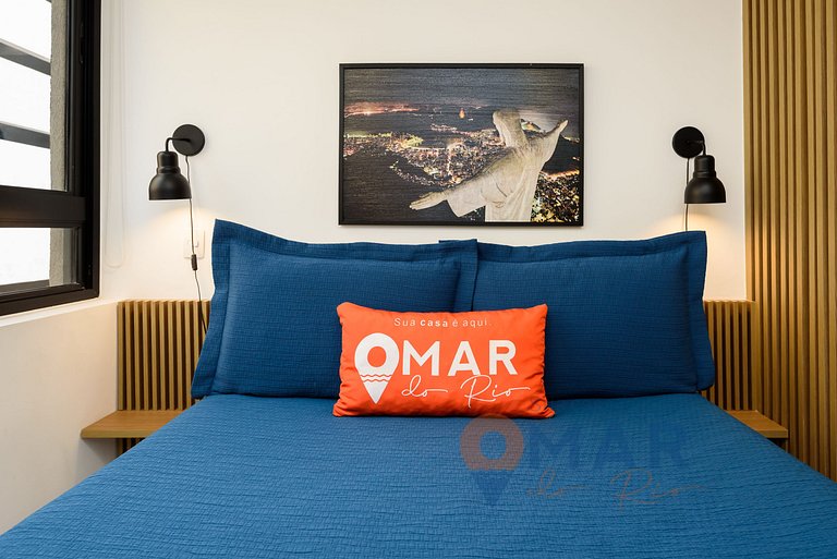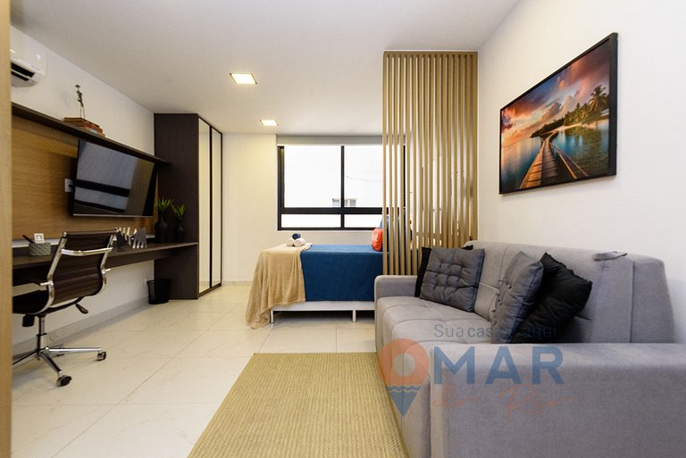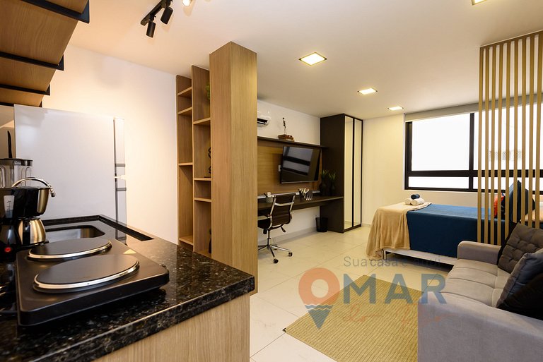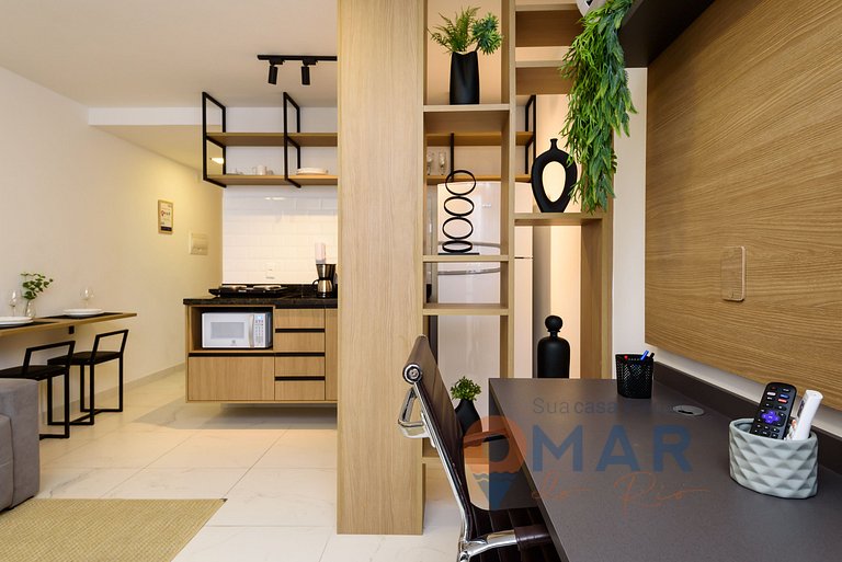 Estúdio: cama casal padrão (188cm x 138cm), sofá, ar-condicionado split, Smart TV 50" com canais abertos (antena digital), estação para trabalho (workstation), bancada com 2 banquetas, guarda-roupa com cabides, cortina blackout e espelho de corpo inteiro.