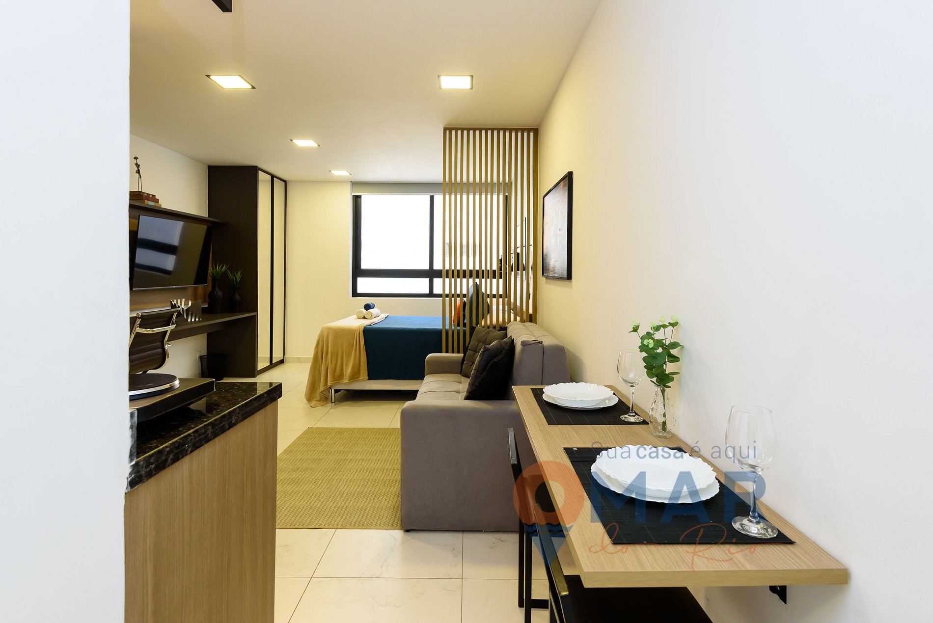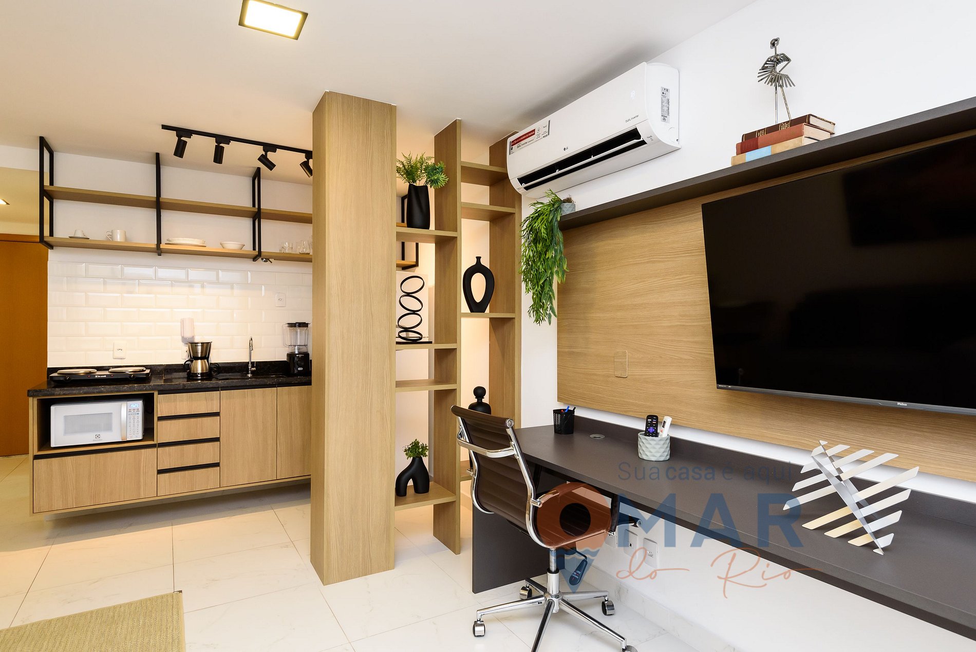 Estúdio: cama casal padrão (188cm x 138cm), sofá, ar-condicionado split, Smart TV 50" com canais abertos (antena digital), estação para trabalho (workstation), bancada com 2 banquetas, guarda-roupa com cabides, cortina blackout e espelho de corpo inteiro.