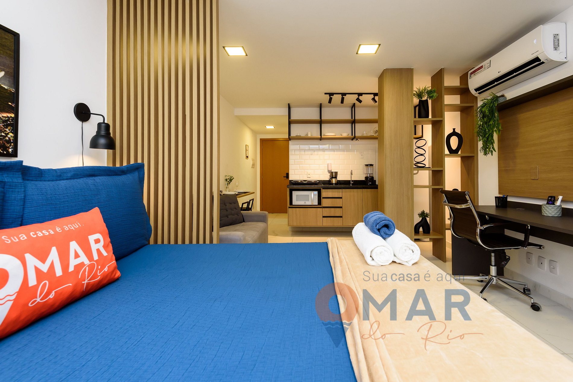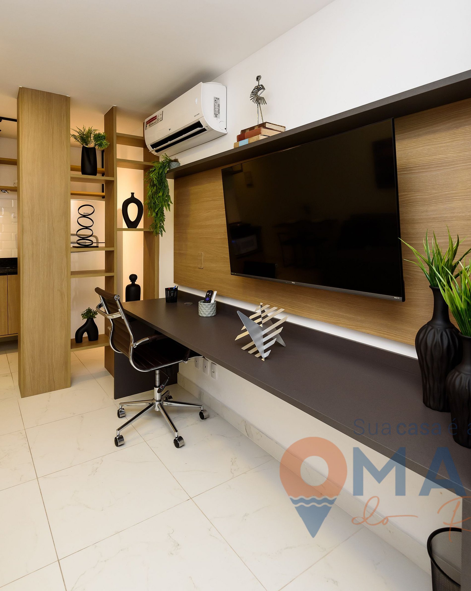 Estúdio: cama casal padrão (188cm x 138cm), sofá, ar-condicionado split, Smart TV 50" com canais abertos (antena digital), estação para trabalho (workstation), bancada com 2 banquetas, guarda-roupa com cabides, cortina blackout e espelho de corpo inteiro.