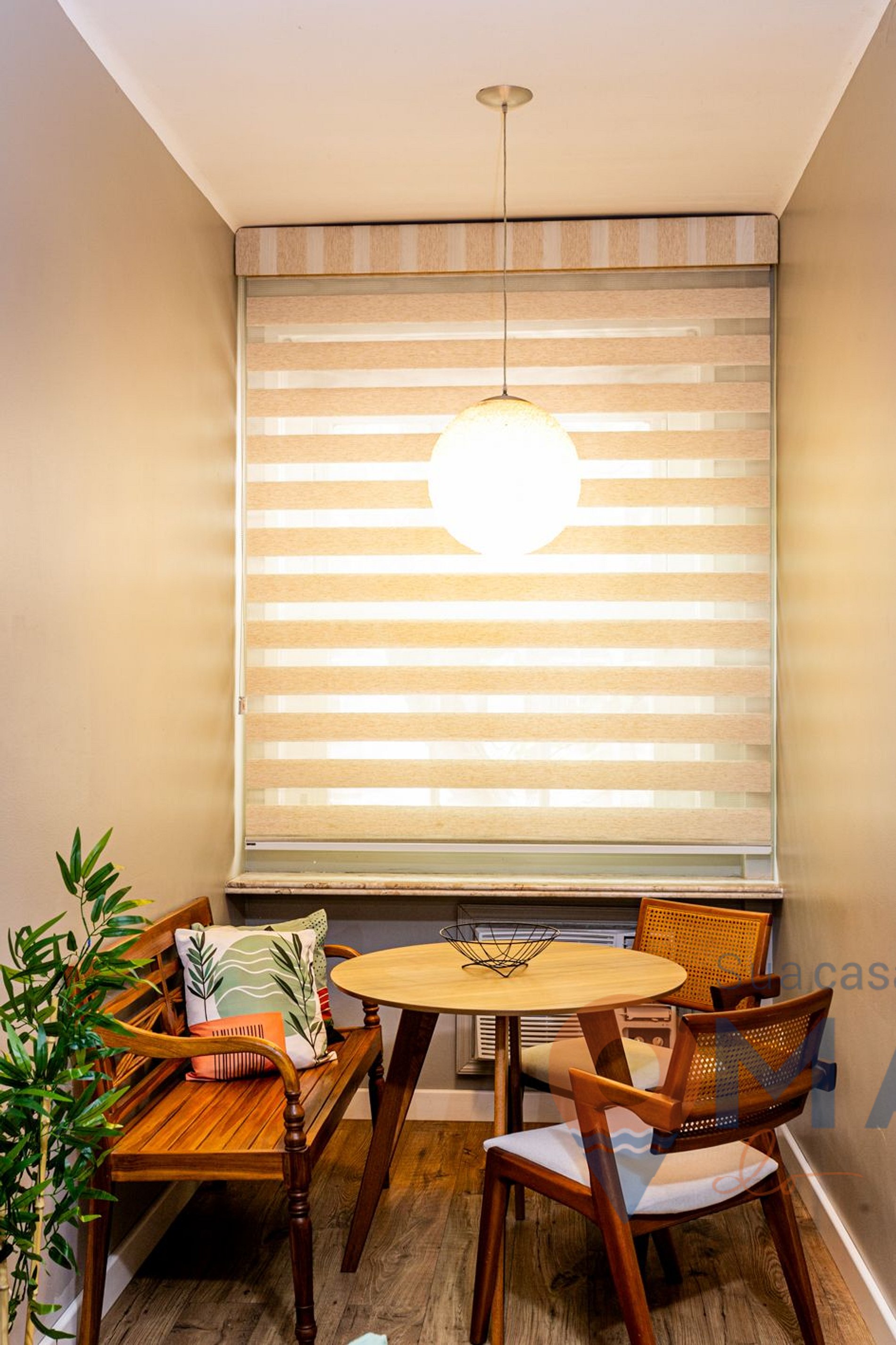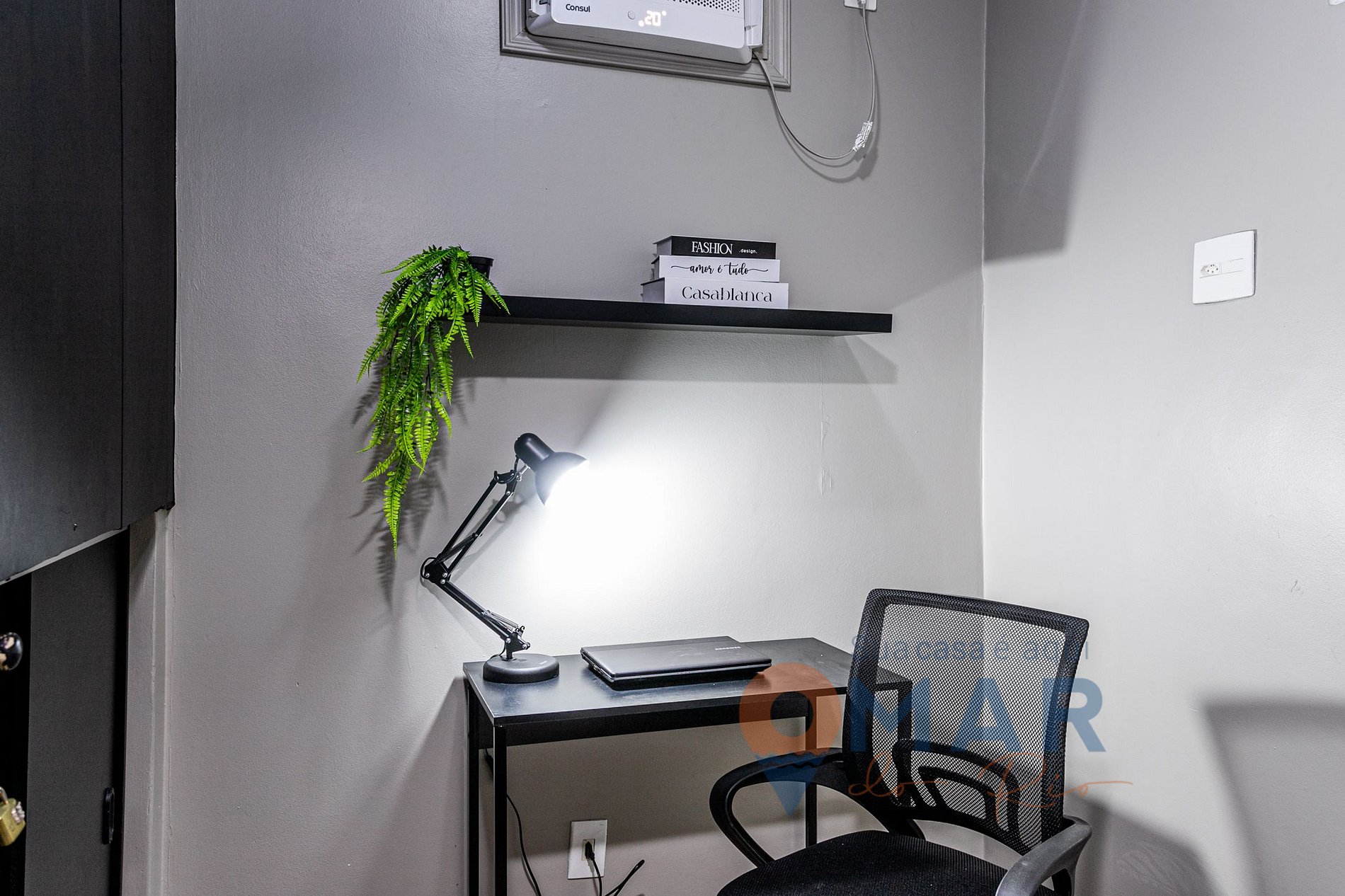 Sala: sofá, ar-condicionado, Smart TV com canais a cabo (Claro TV box), mesa de jantar com assentos, bancada com banquetas, ventilador de teto e cortina translúcida.