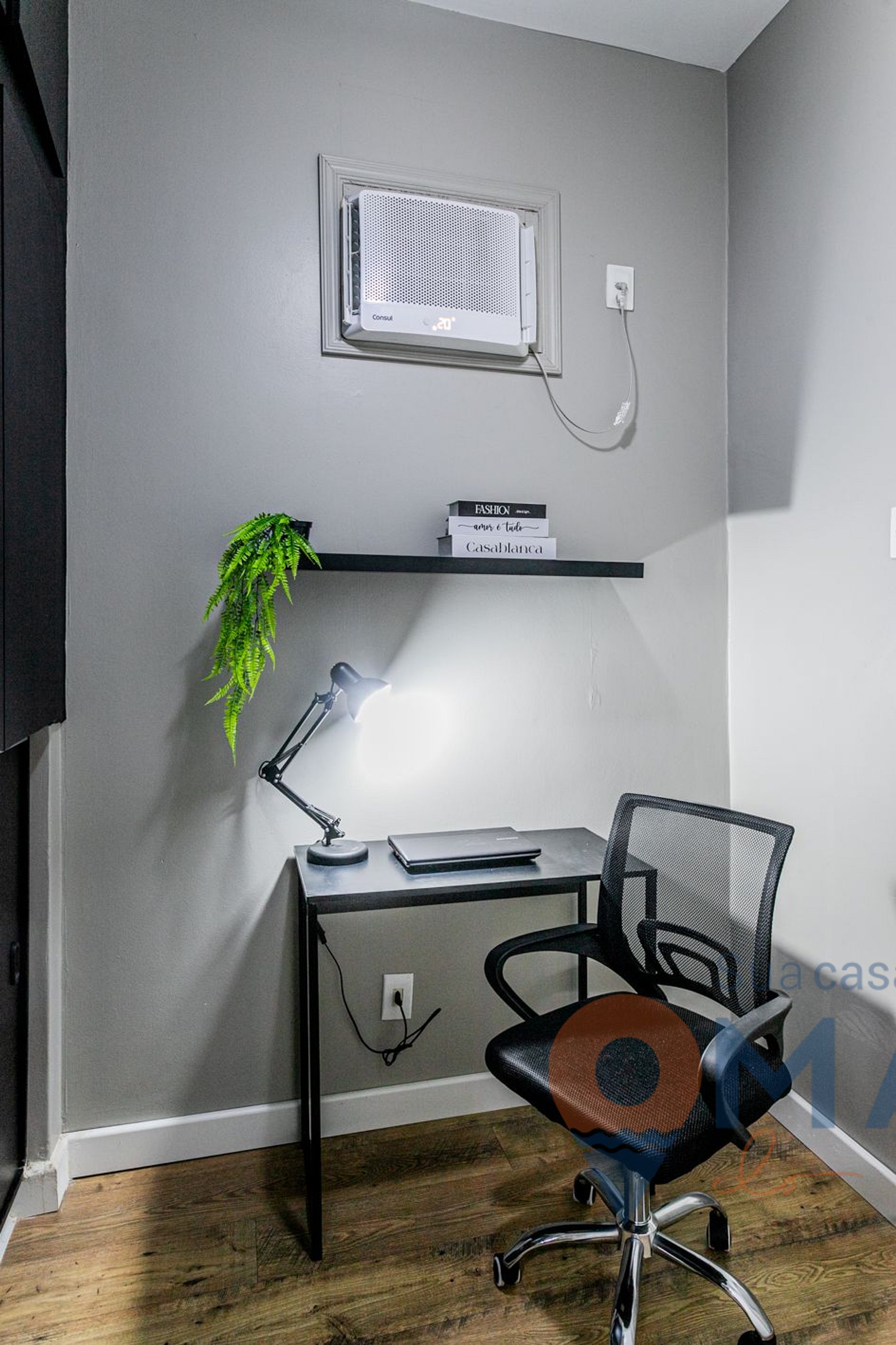 Workstation: mesa, cadeira, luminária, ar-condicionado e ventilador.