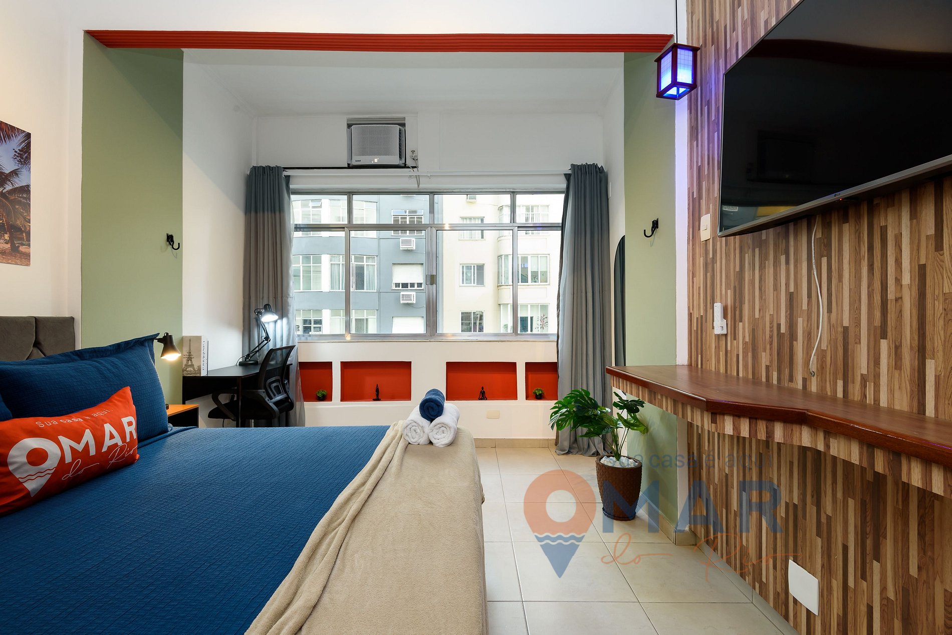 Estúdio: cama Queen Size (198cm x 158cm) , ar-condicionado, cortina blackout, guarda-roupa com cabides, Smart TV 50" com canais abertos (antena), estação de trabalho (workstation), rede de descanso e espelho de corpo inteiro.