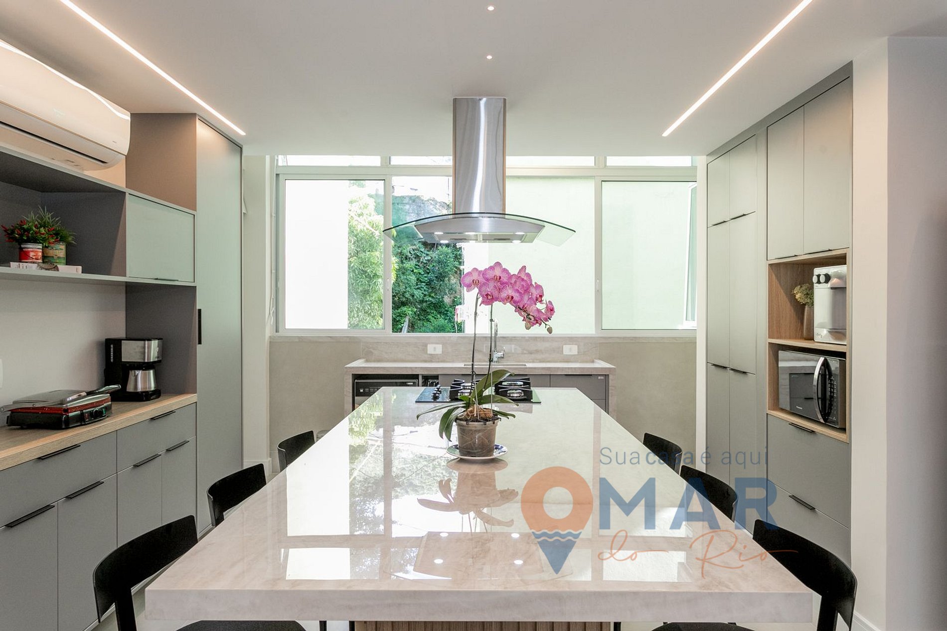 Cozinha: Geladeira, cooktop 4 bocas, cafeteira, liquidificador, micro-ondas, forno embutido, bancada com 7 cadeiras.