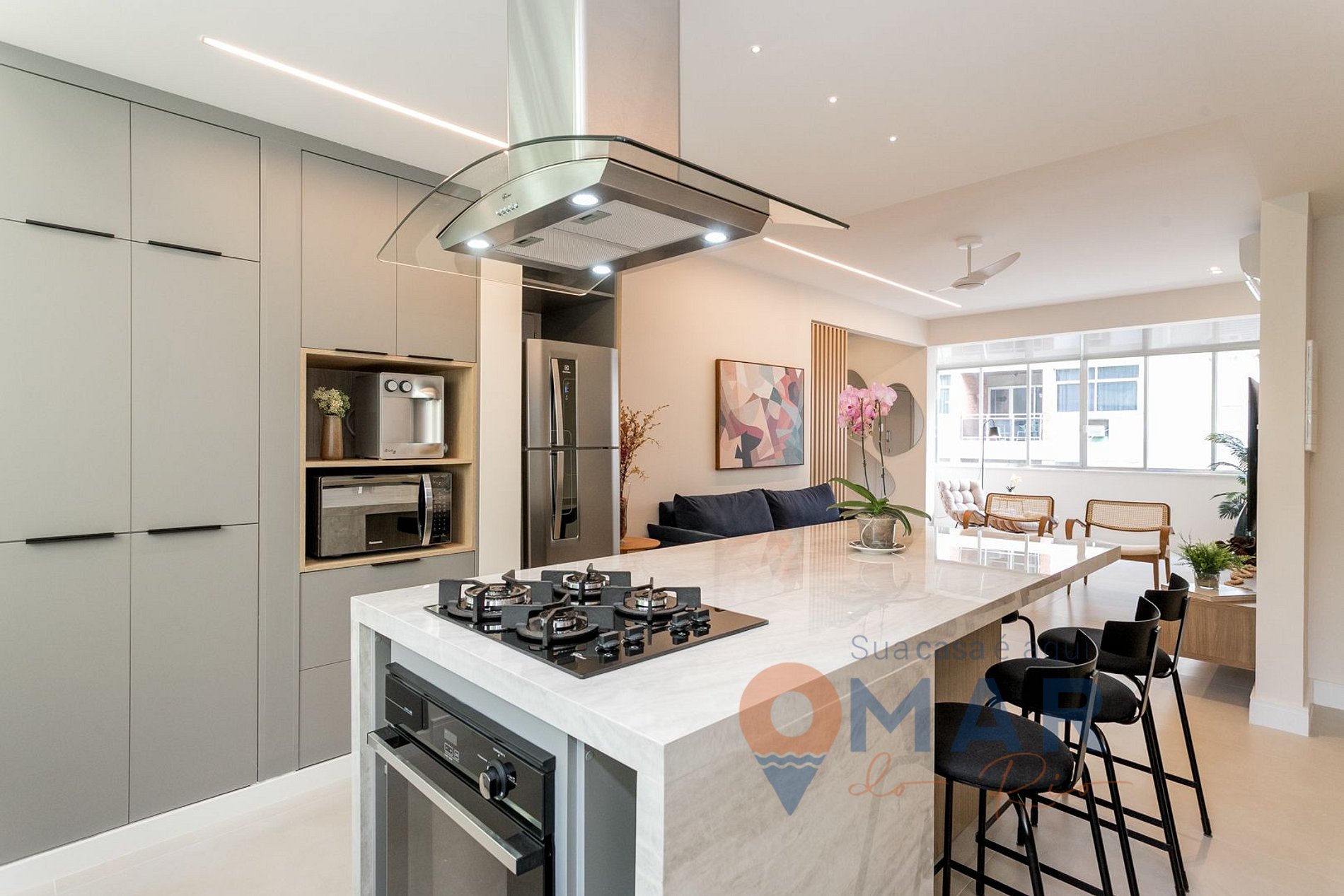 Cozinha: Geladeira, cooktop 4 bocas, cafeteira, liquidificador, micro-ondas, forno embutido, bancada com 7 cadeiras.
