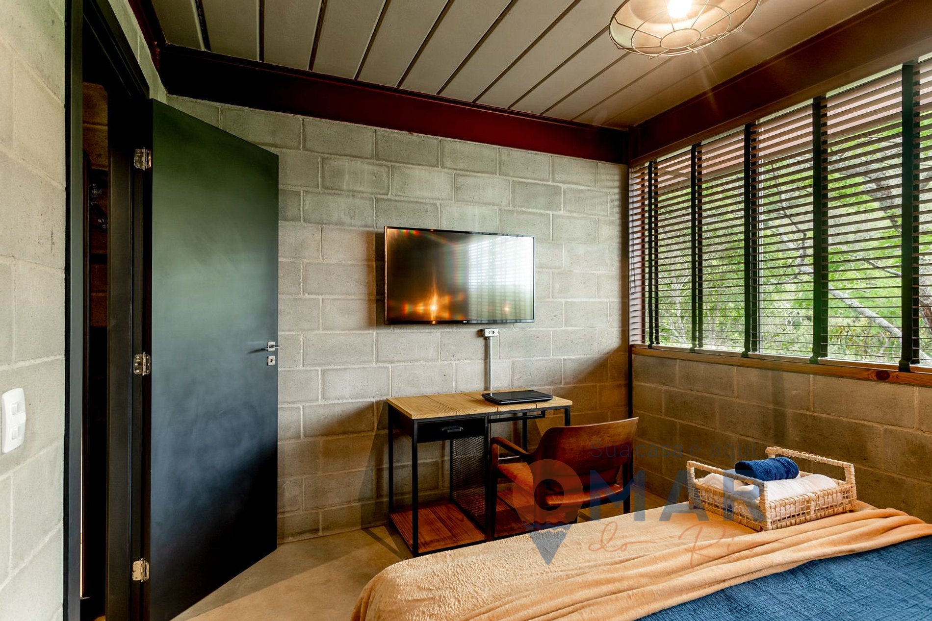 Quarto 2: Cama Queen Size (198cm x 158cm), ar condicionado split, Smart TV, cabideiro, persiana rolo blackout.