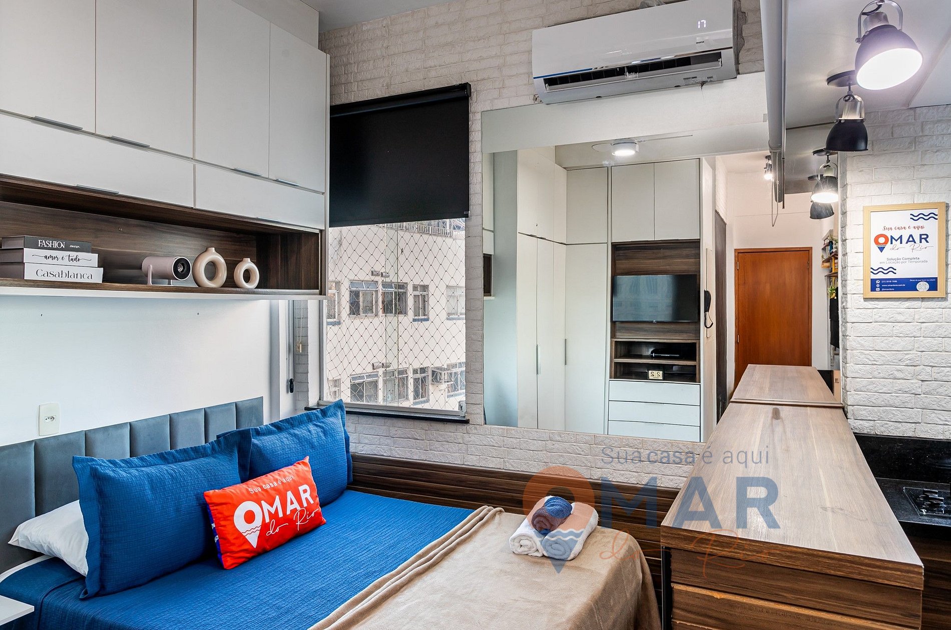Studio: cama casal padrão (188cm x 138cm), Smart TV com acesso aos canais (aplicativo Claro TV +), Projetor com telão, ar-condicionado, guarda-roupas com cabides e blackout.