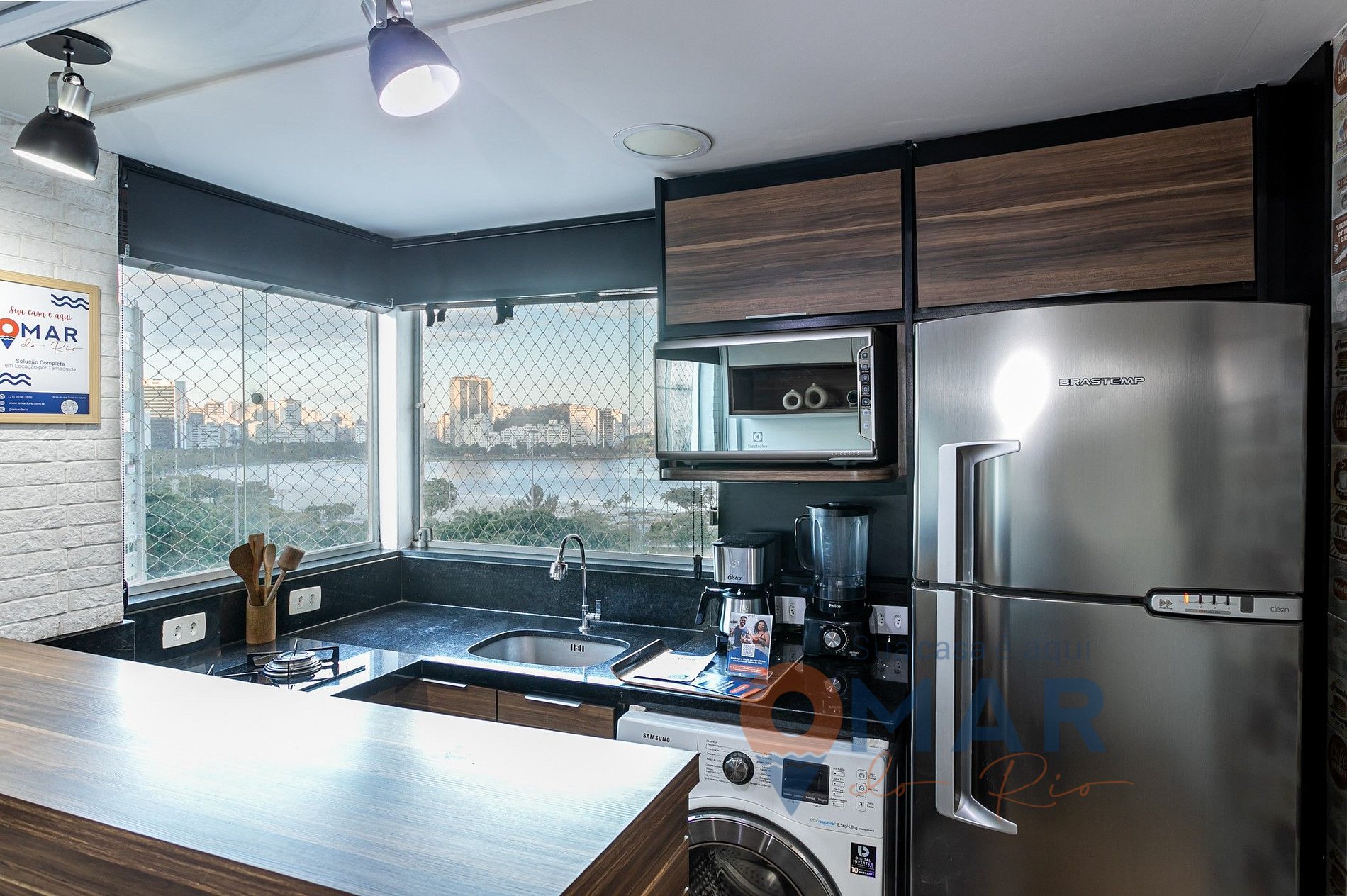 Cozinha: geladeira, cooktop, cafeteira, liquidificador, micro-ondas, bancada com 2 banquetas e utensílios de cozinha.