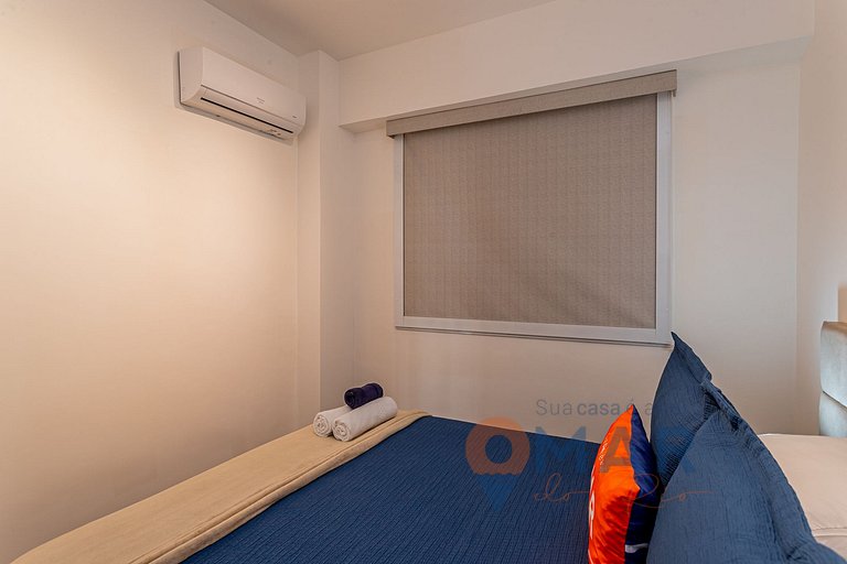 Quarto 2: cama Queen Size (198cm x 158cm), ar-condicionado split, arara aberta com cabides e cortina blackout.