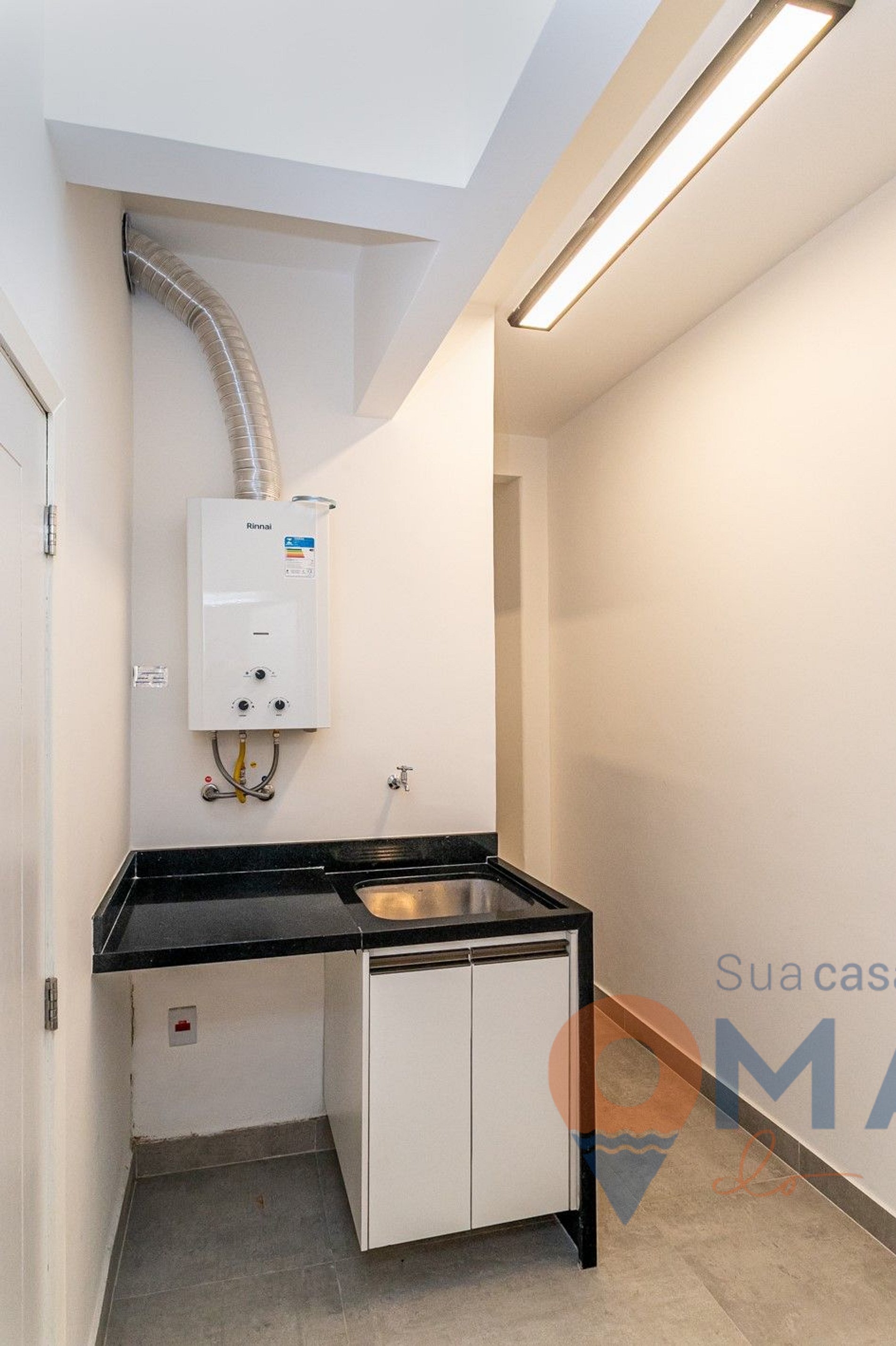 Cozinha: cooktop 5 bocas, geladeira, micro-ondas, lava-louças, cafeteira, sanduicheira, liquidificador e utensílios.