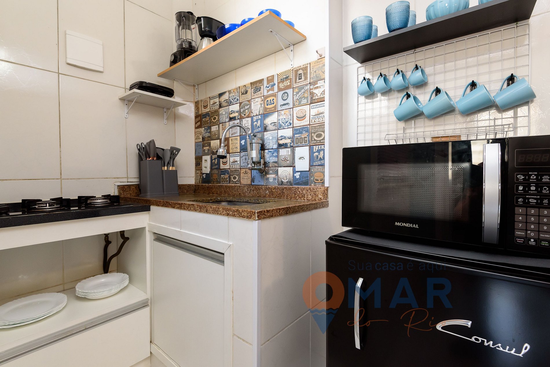 Cozinha: cooktop 2 bocas, frigobar, cafeteira, sanduicheira, liquidificador e utensílios.