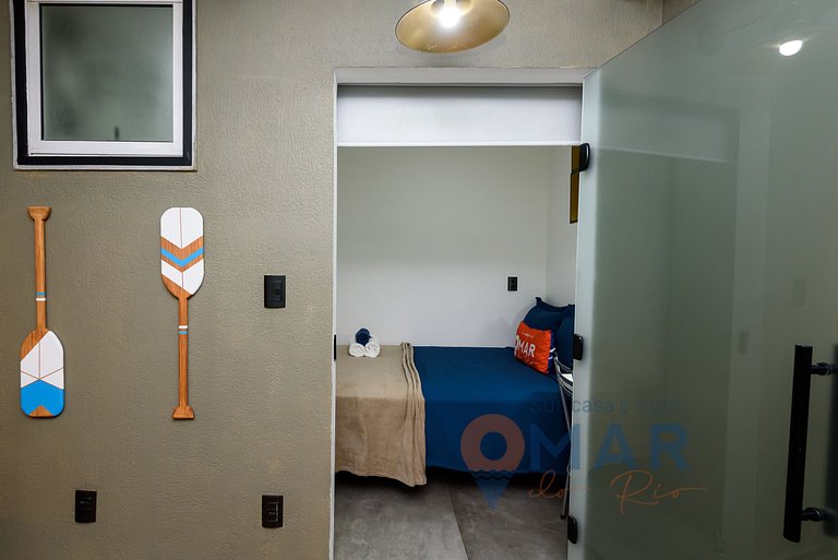 Suíte principal: cama Queen Size (198cm x 158cm), ar-condicionado split, Smart TV, arara aberta com cabides, ventilador de teto, mesa de apoio com cadeira e cortina blackout.