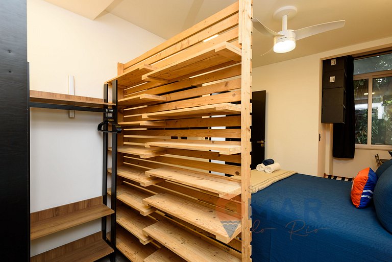 Quarto: cama casal padrão (188cm x 138cm), ar-condicionado split, workstation, arara aberta com cabides e cortina blackout.