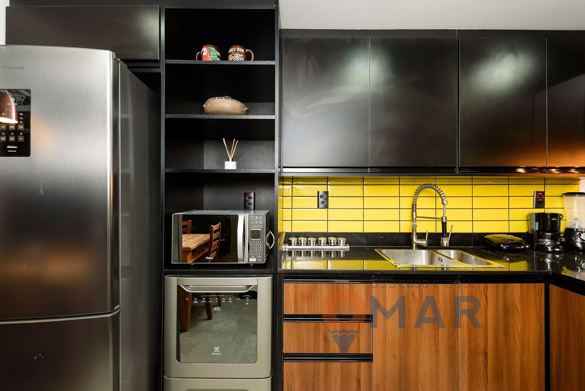Cozinha: cooktop 4 bocas, forno, micro-ondas, cafeteira, liquidificador e utensílios