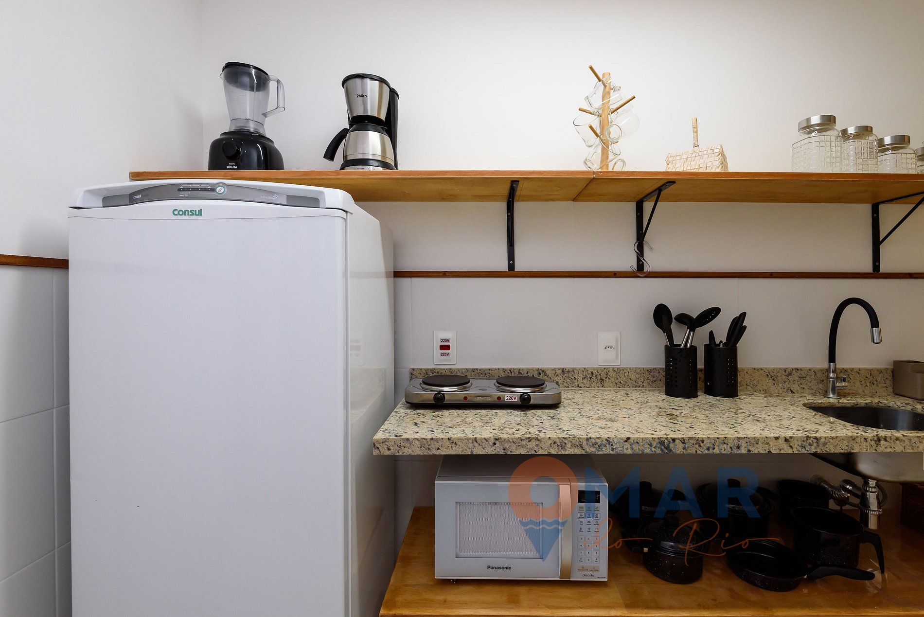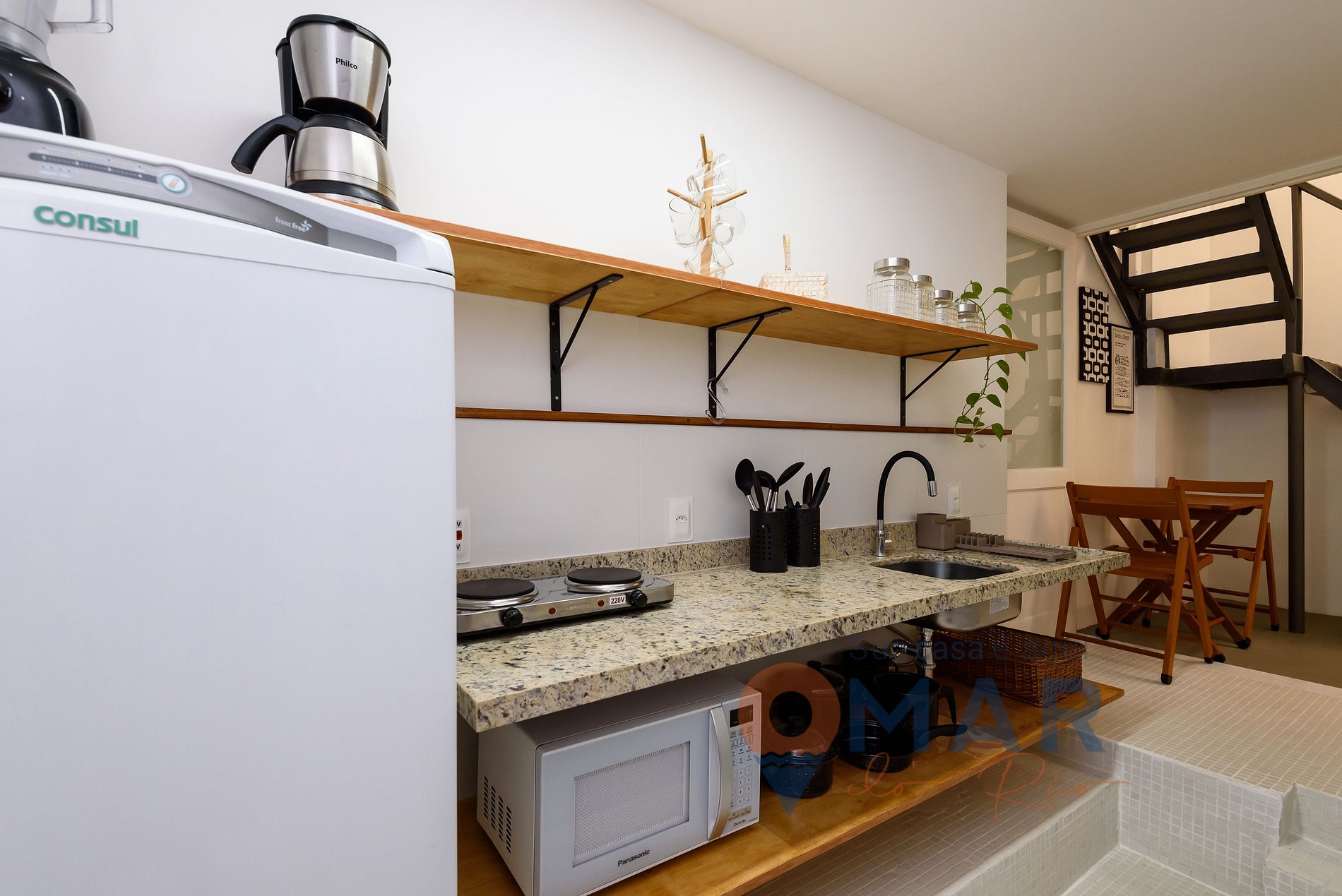 Cozinha: Geladeira, cooktop 2 bocas, panela elétrica, torradeira, micro-ondas, liquidificador, purificador de água, air fryer, cafeteira e utensílios para cozinhar.
