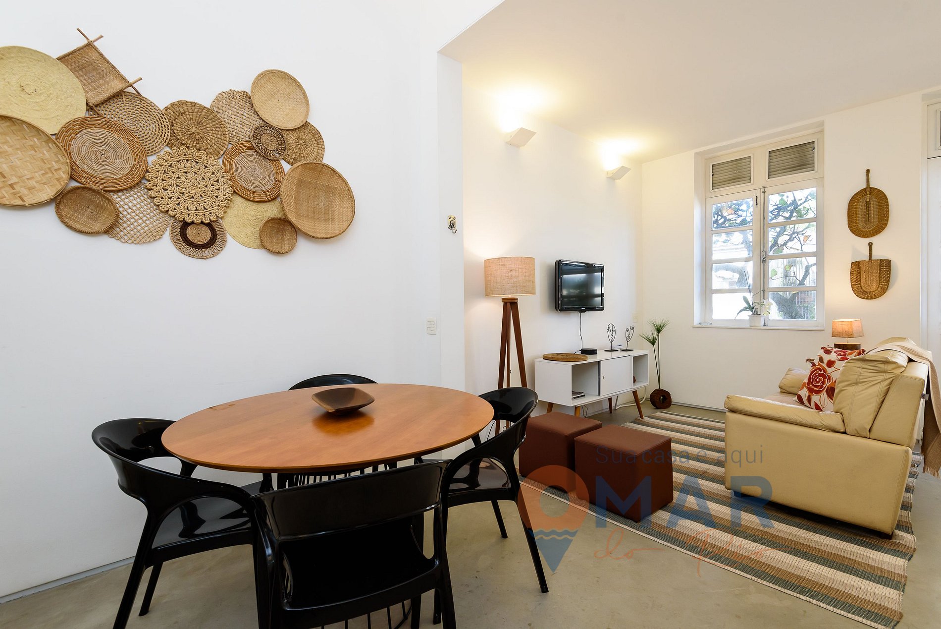 Sala: Sofá, TV com canais a cabo (Claro TV), rede de descanso, workstation e mesa de jantar.