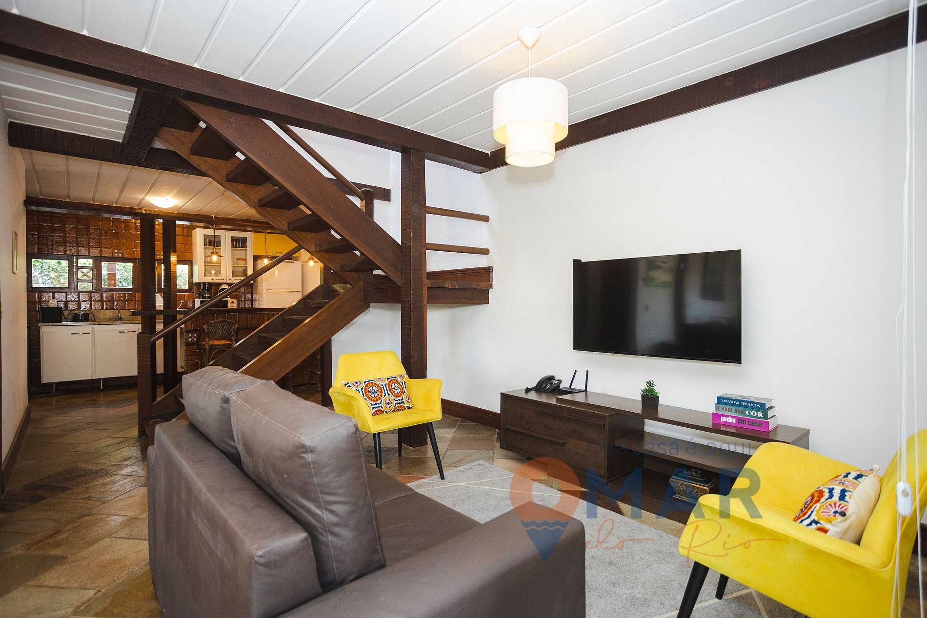 Sala de estar (1º andar): Sofá, smart TV + Roku, ar-condicionado split, duas poltronas + sala de jantar com 6 cadeiras.