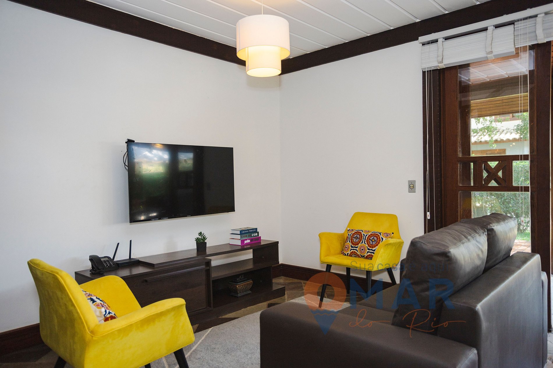Sala de estar (1º andar): Sofá, smart TV + Roku, ar-condicionado split, duas poltronas + sala de jantar com 6 cadeiras.