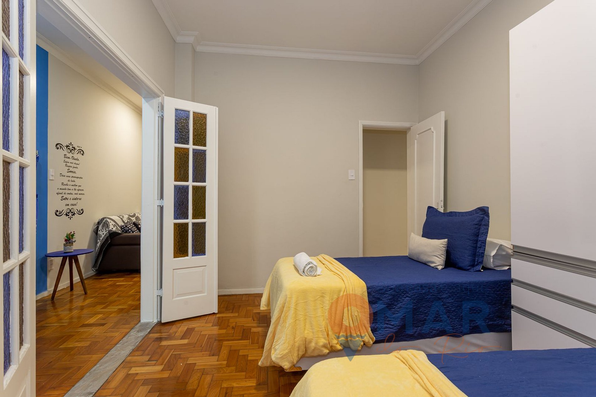 Quarto 2: Duas Camas de Solteiro (188cm x 88cm), ar condicionado split, armário, cortina blackout.