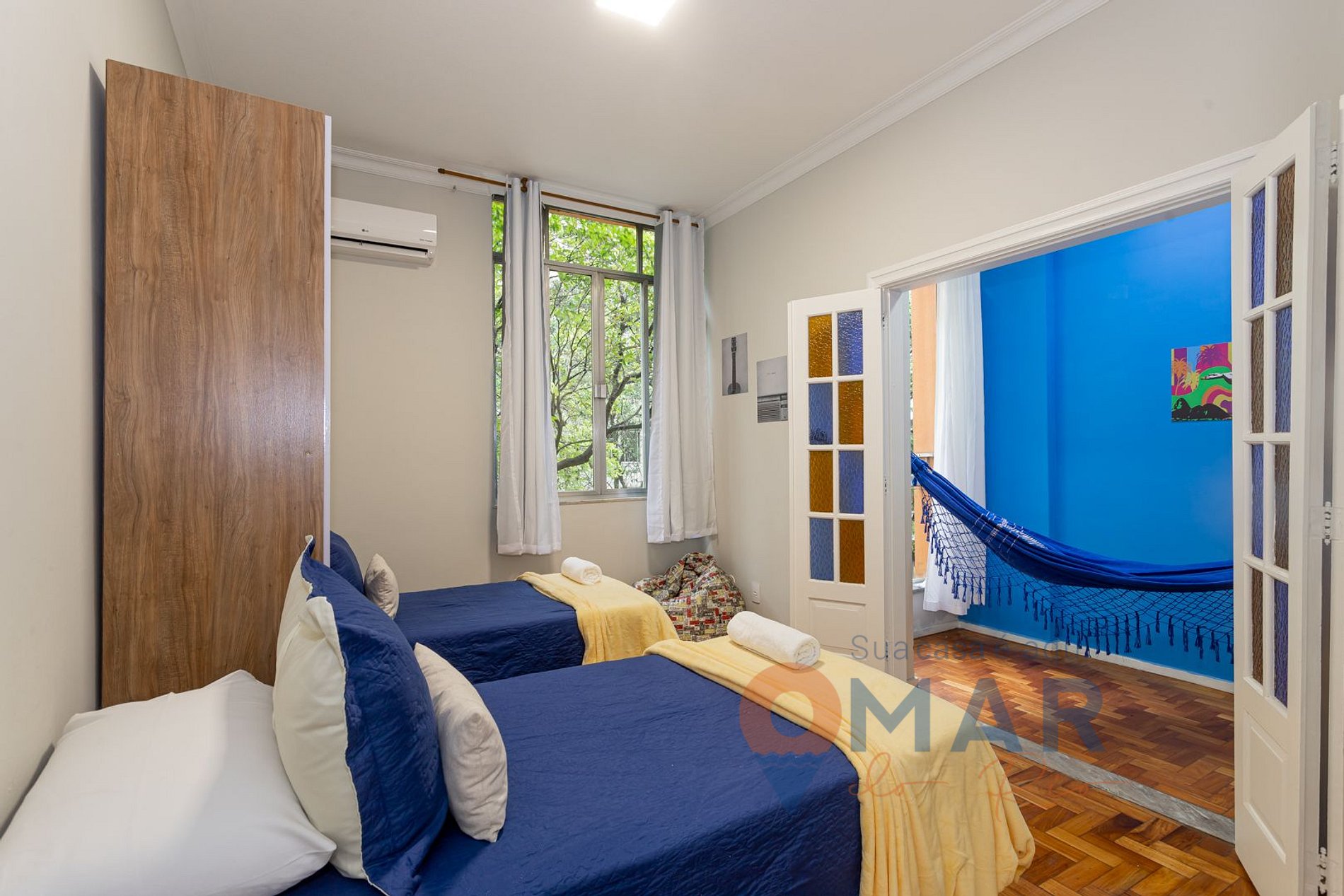 Quarto 2: Duas Camas de Solteiro (188cm x 88cm), ar condicionado split, armário, cortina blackout.