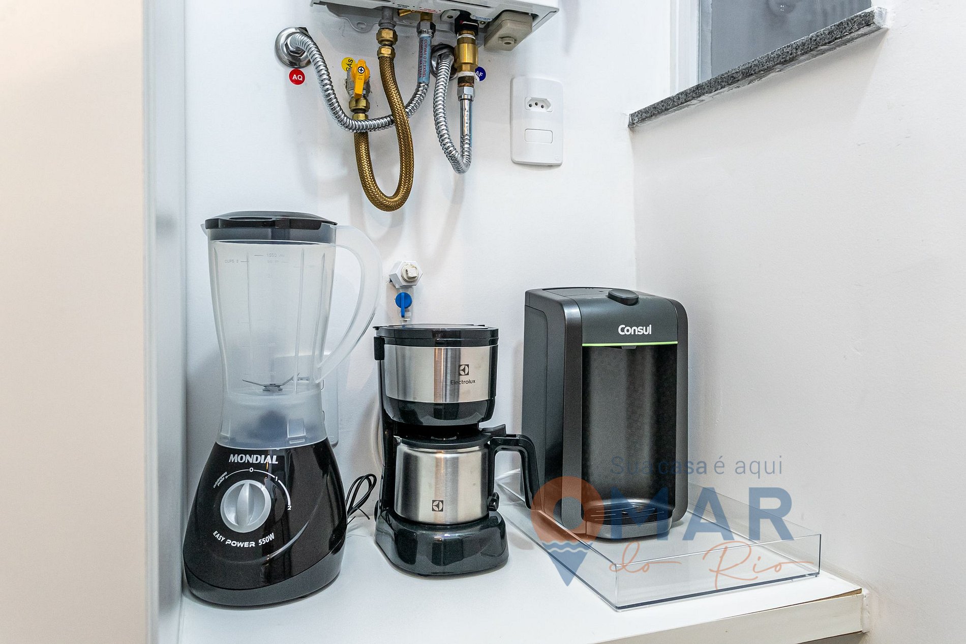 Cozinha: cooktop 2 bocas, geladeira, micro-ondas, cafeteira, liquidificador, torradeira, air fryer, purificador de água e utensílios.