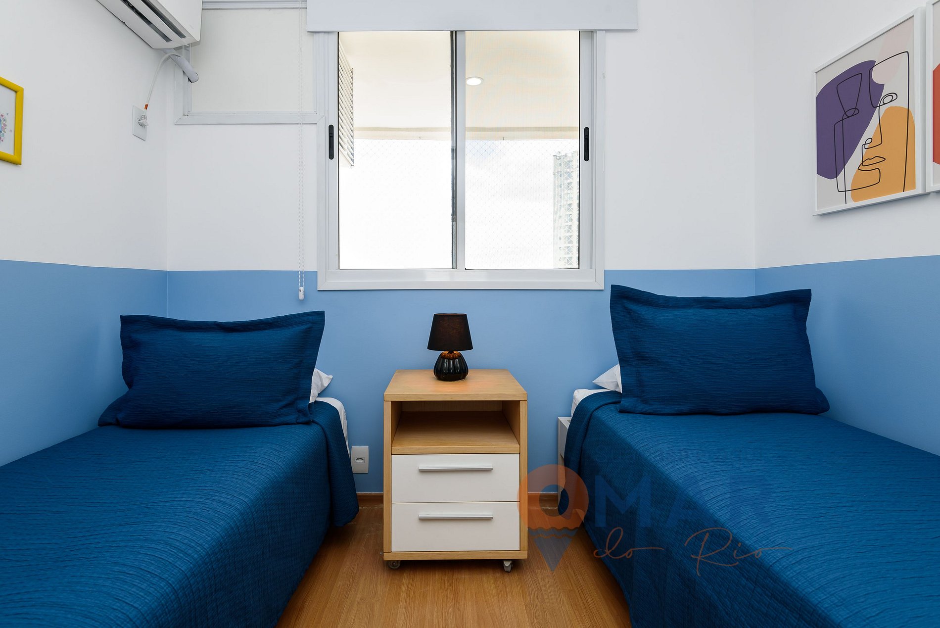 Quarto: 1 bicama(188cm x 88cm)(cama auxiliar 1,80 x 80cm), 1 cama de solteiro (1,88cm x 88cm), ar-condicionado, armário fechado, cortina blackout.