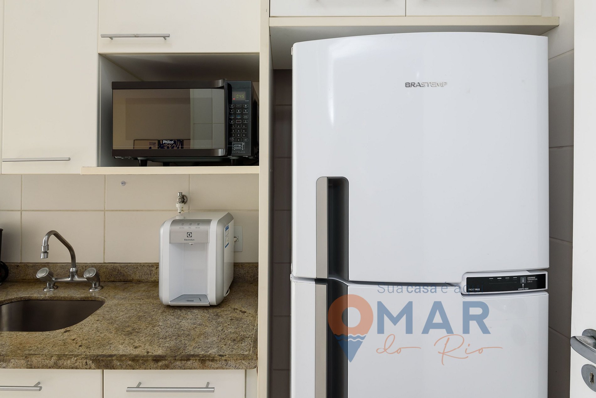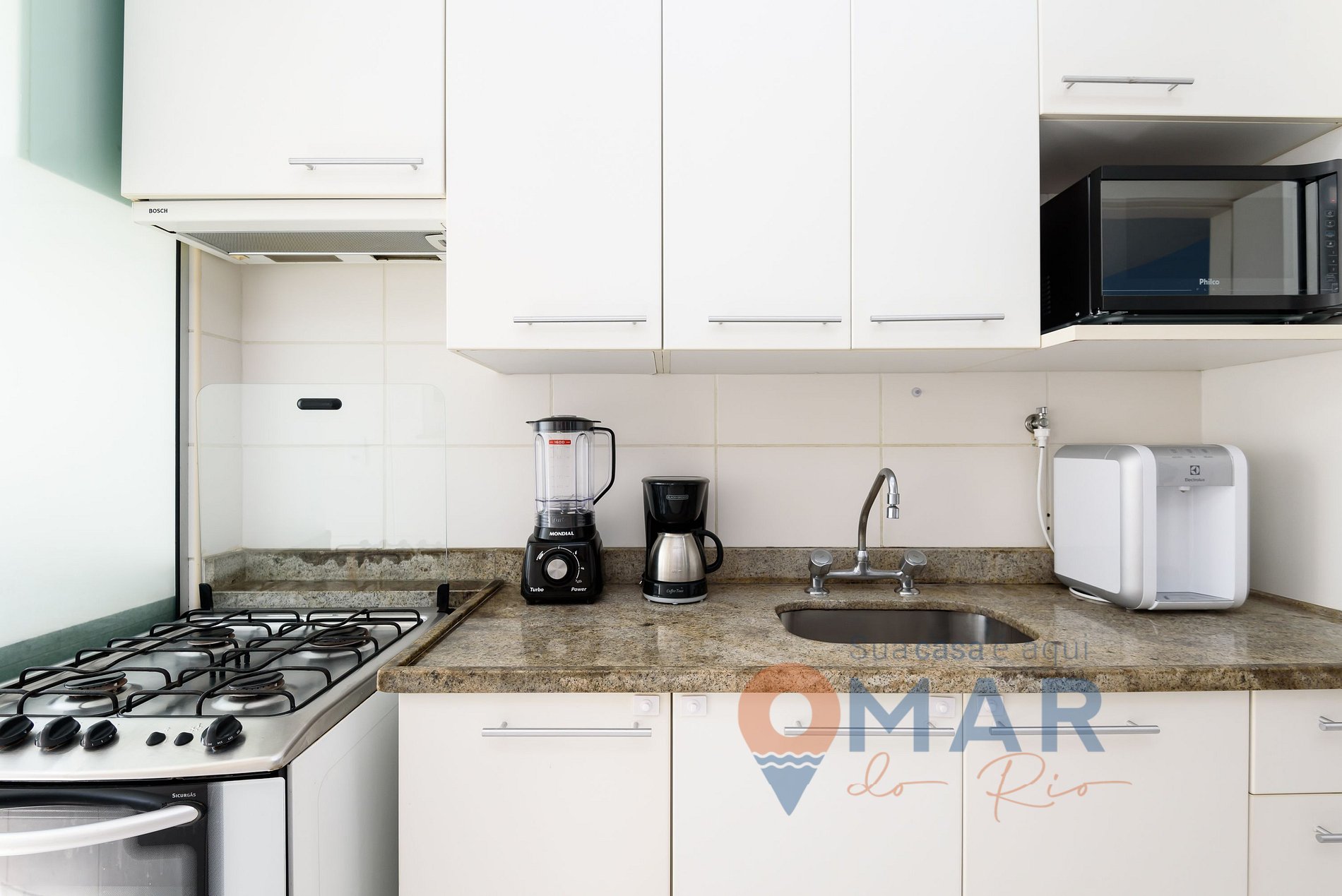 Cozinha: fogão, geladeira, forno, micro-ondas, cafeteira, liquidificador, purificador de água, taças e utensílios.
