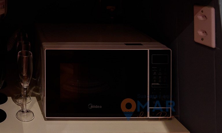 Cozinha: Frigobar, micro-ondas, liquidificador, filtro d'água e cafeteira.
