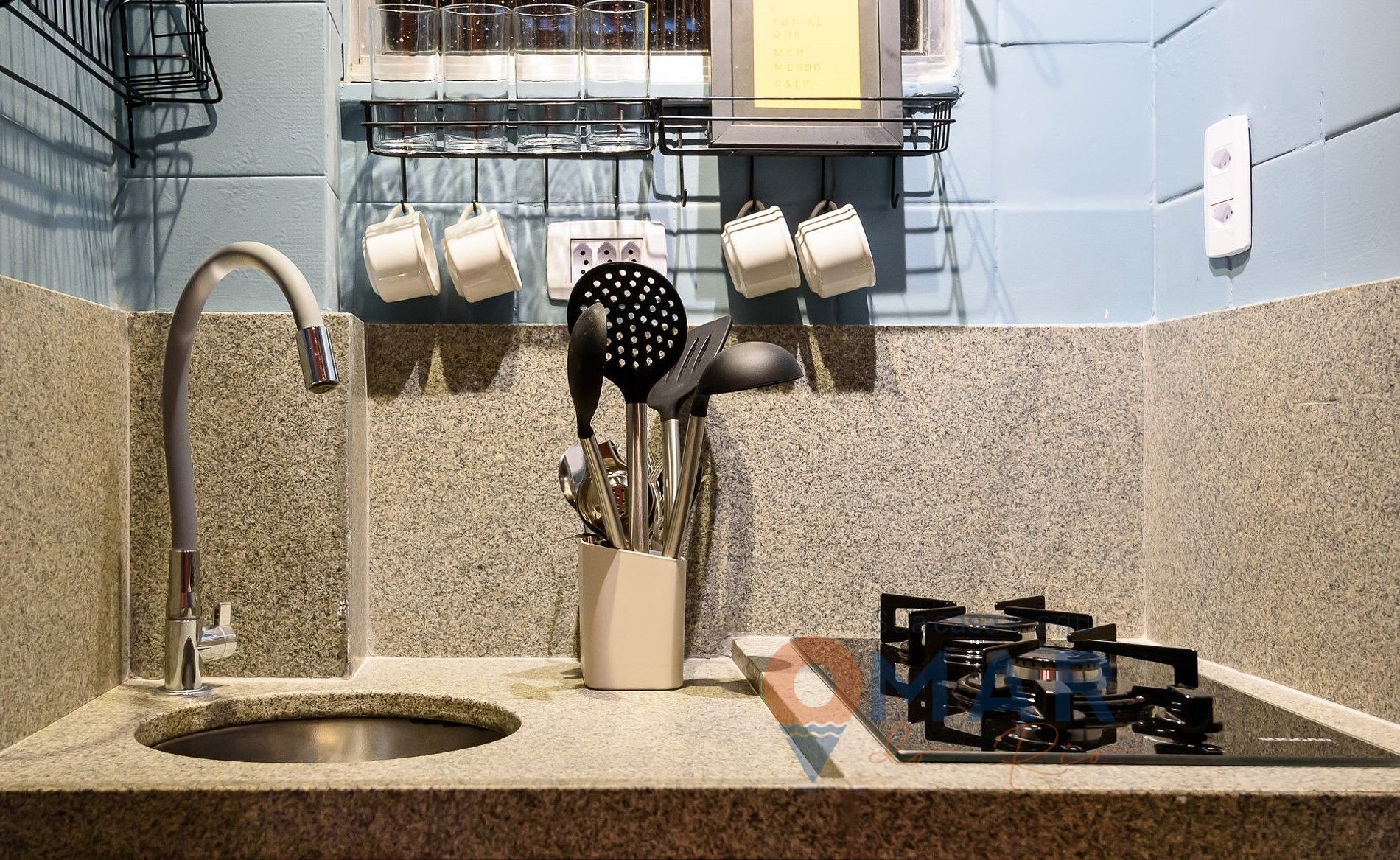 Cozinha: Frigobar, micro-ondas, liquidificador, filtro d'água e cafeteira.
