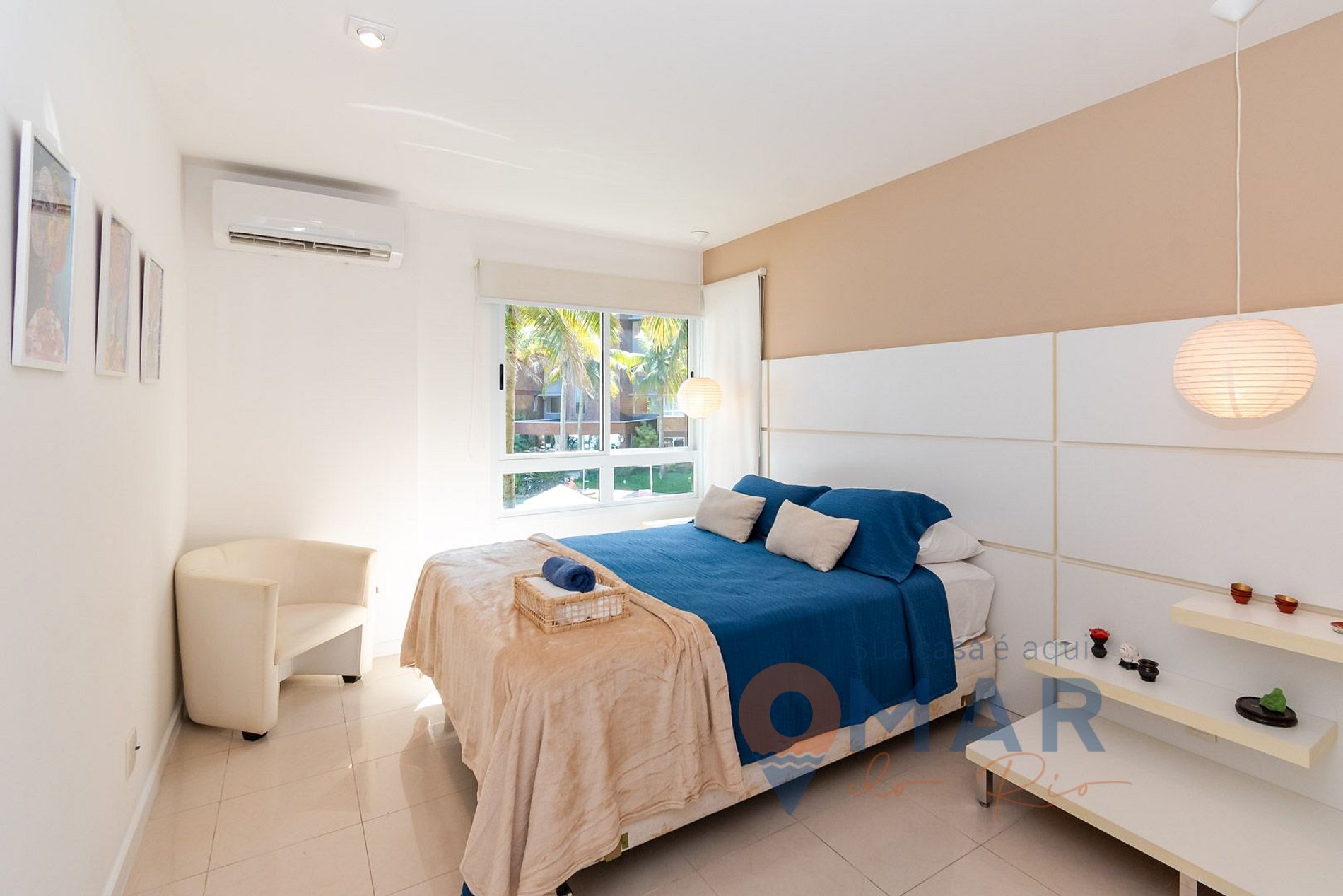 Suíte principal: Uma cama de casal padrão (188cm x 138cm), poltrona, ar-condicionado split, persiana blackout e guarda-roupa.