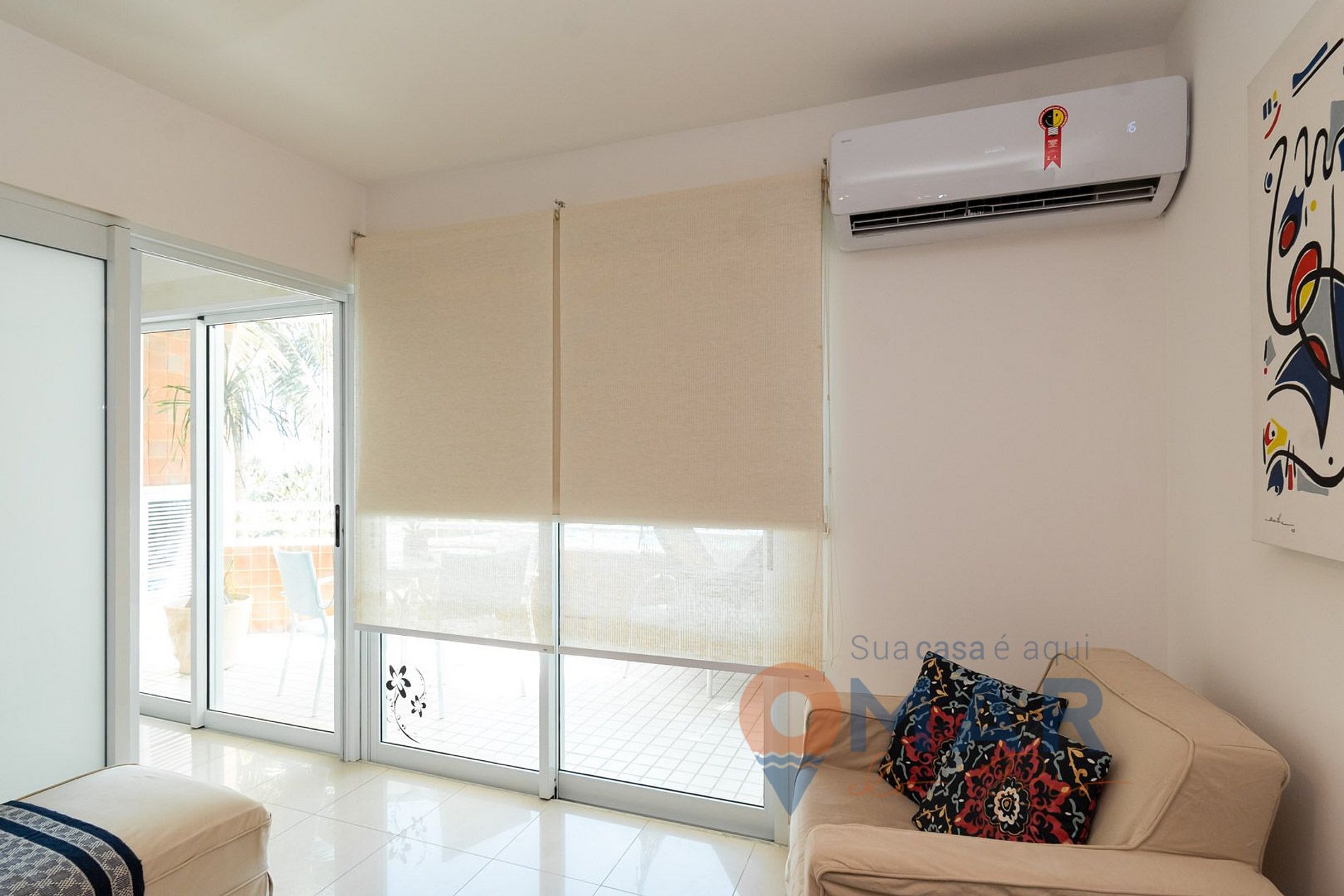 Sala: Sofá, poltrona, ar-condicionado split, televisão com canais a cabo e persiana.