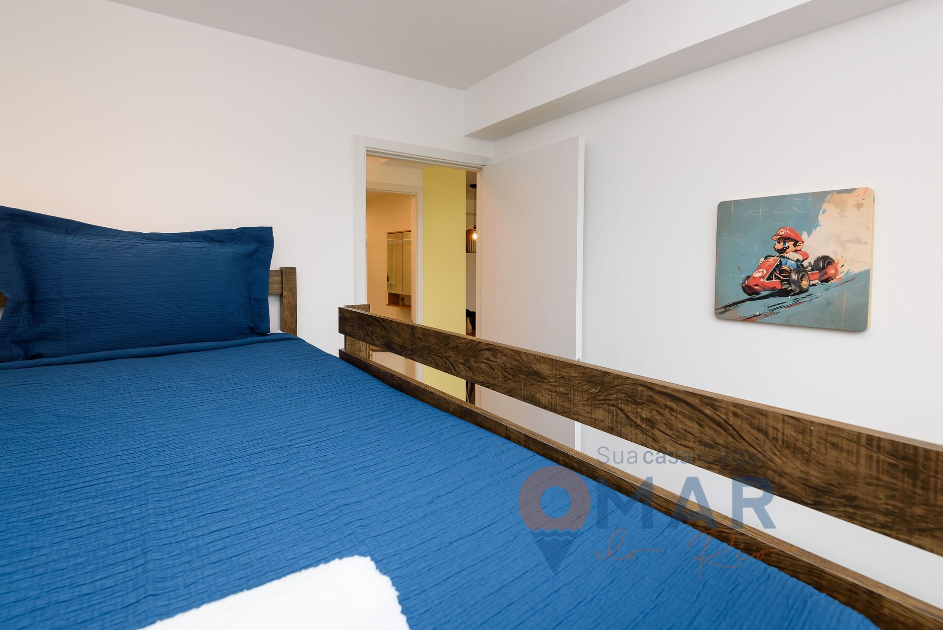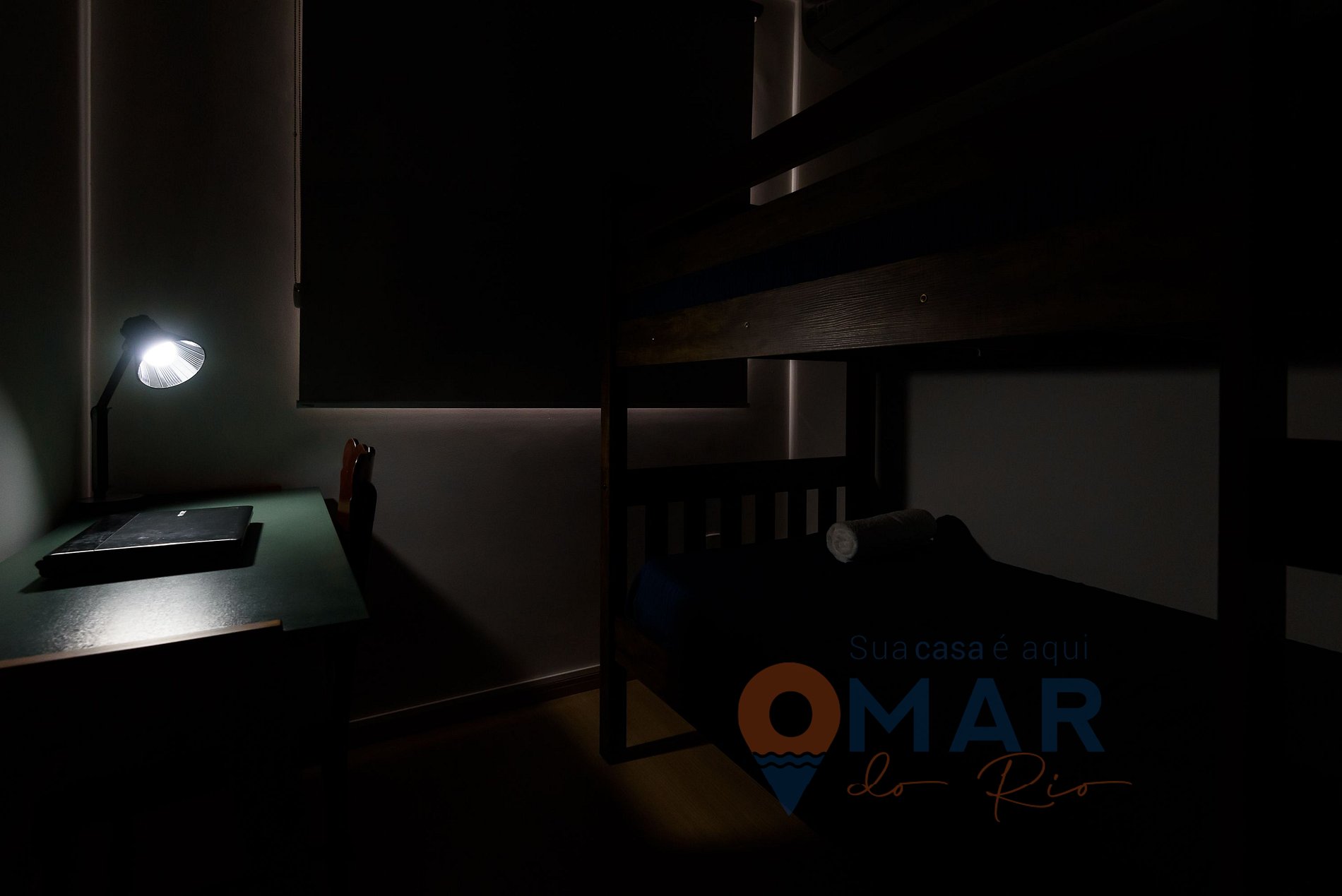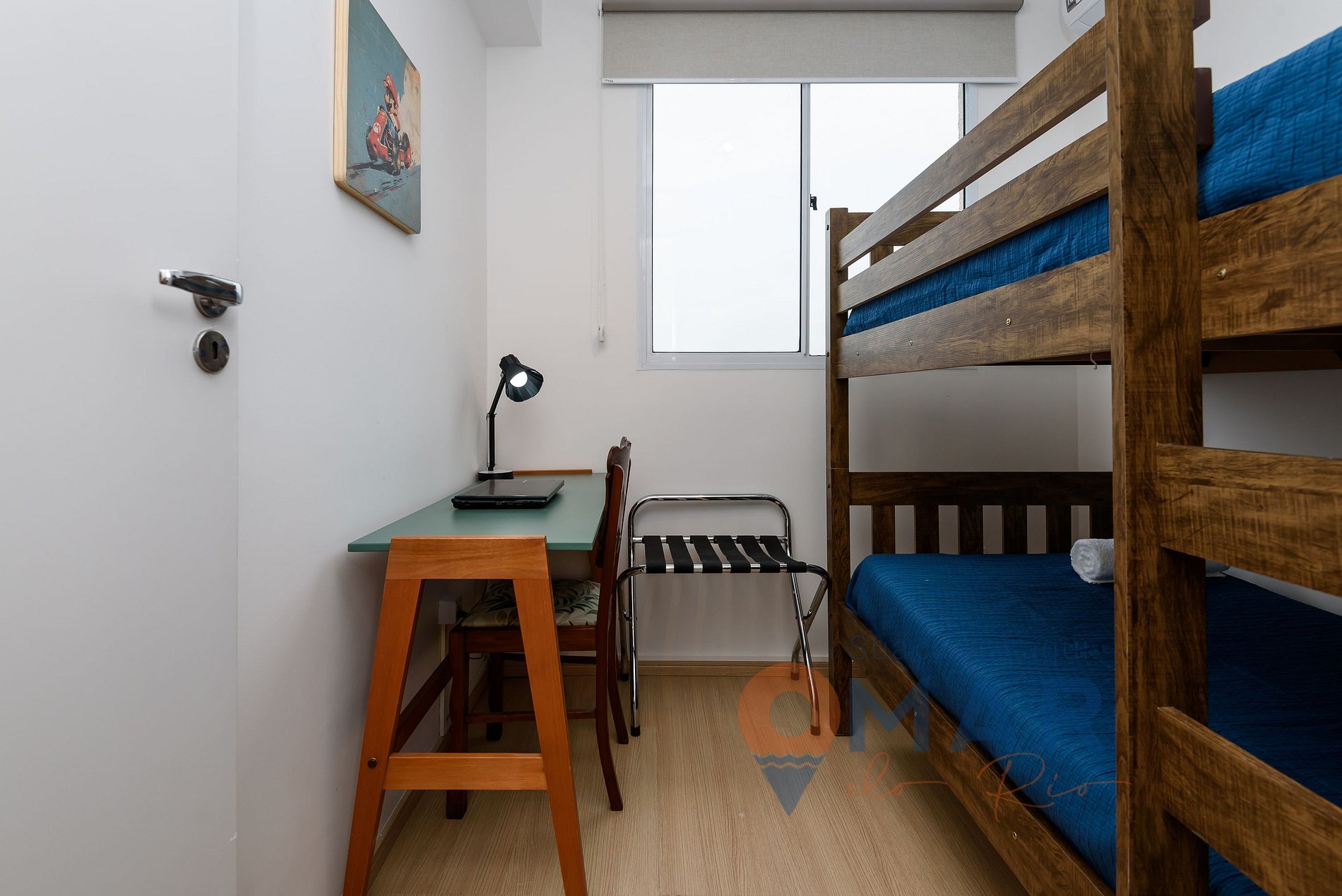 Quarto 2: beliche cama de solteiro (188cm x 88cm), ar-condicionado, workstation, maleiro e cortina blackout.