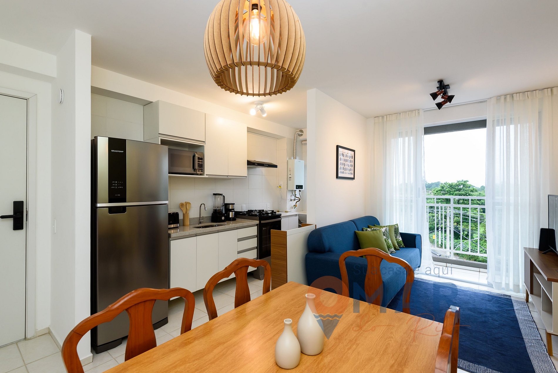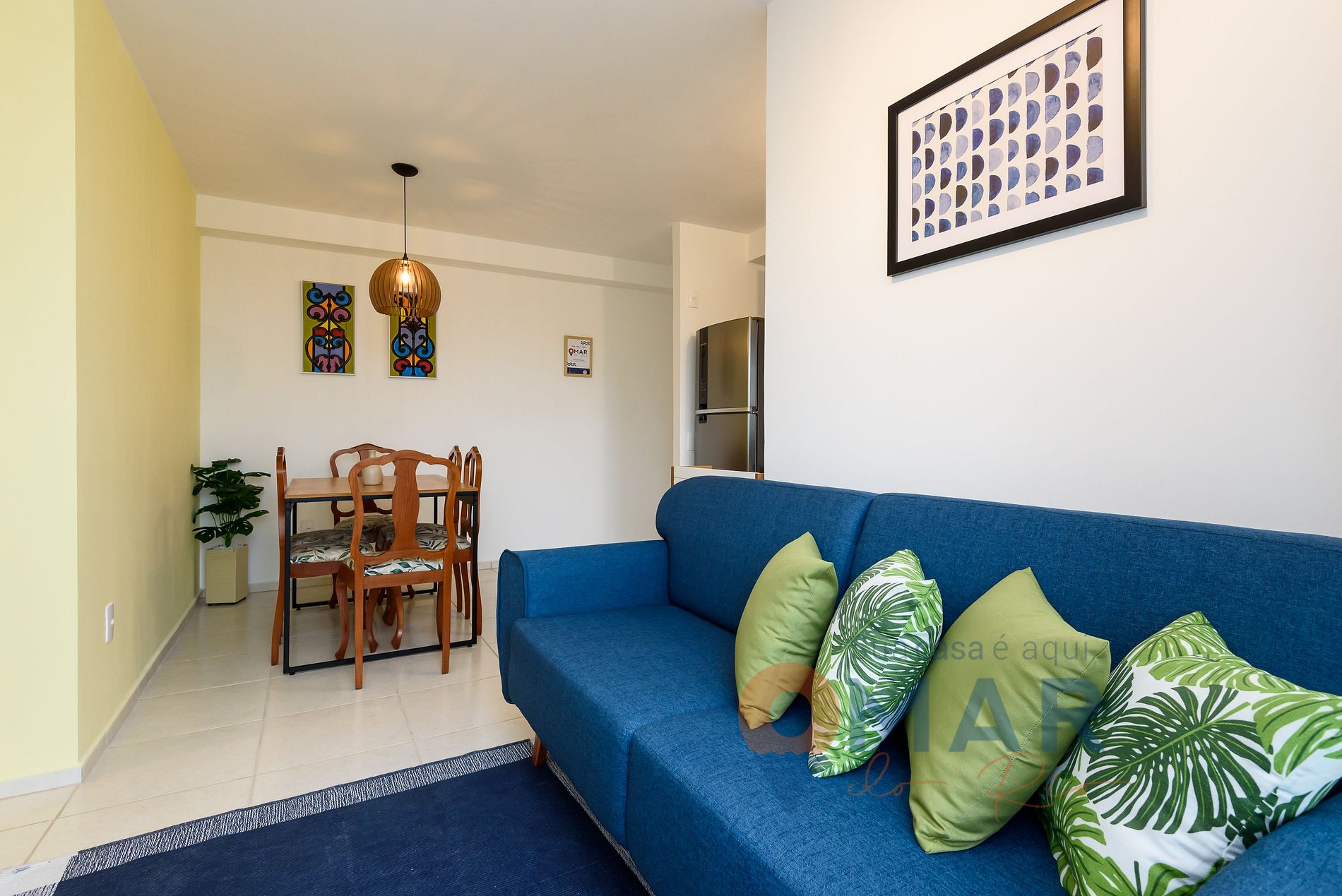 Sala: sofá, Smart TV com canais básicos (antena digital), mesa com cadeiras e cortina translúcida.