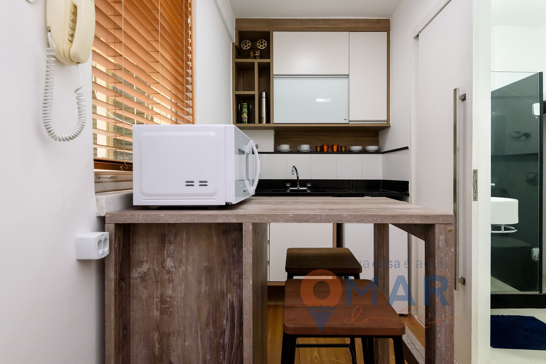 Cozinha: cooktop 2 bocas, frigobar, micro-ondas, bancada com banquetas, cafeteira Nespresso, liquidificador, purificador de água e utensílios