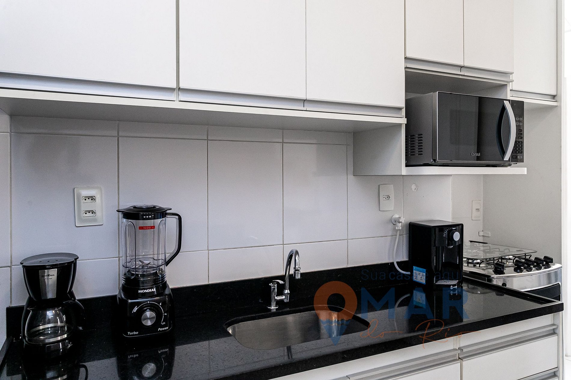 Cozinha: Geladeira, fogão e forno, micro-ondas, cafeteira comum, liquidificador, purificador de água e utensílios de cozinha.