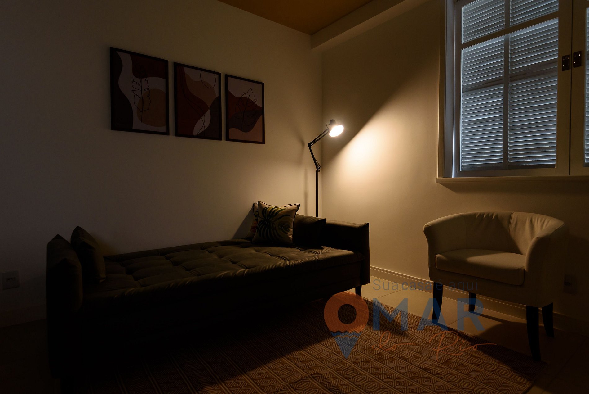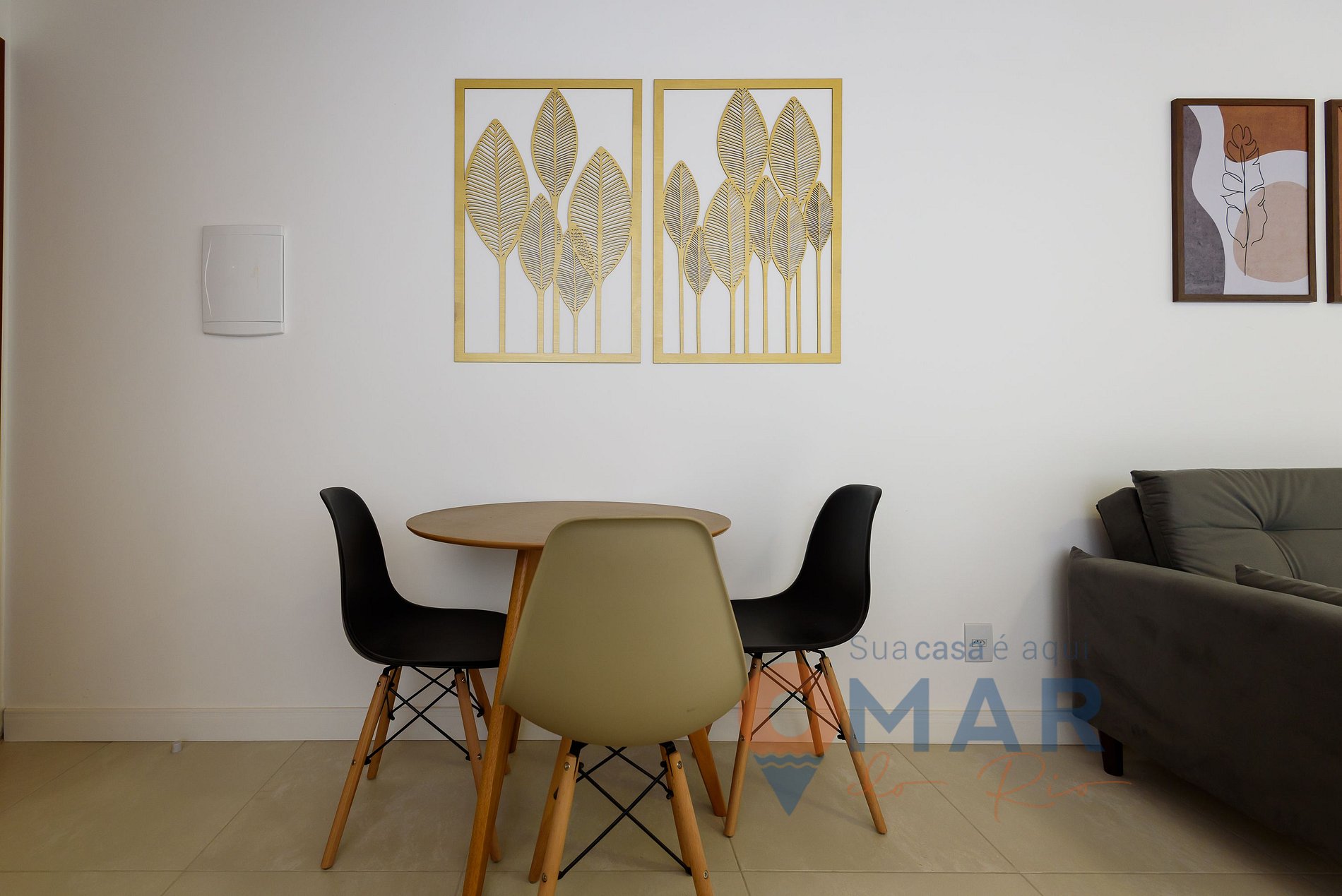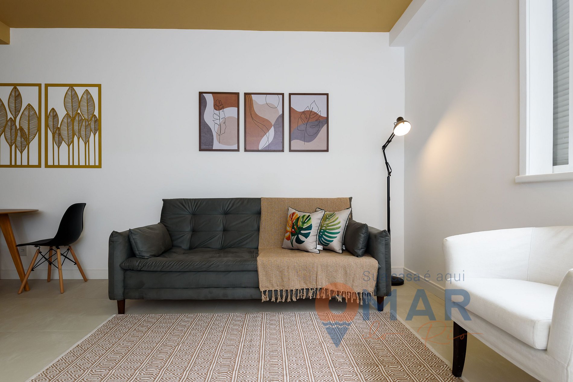 Sala: sofá-cama(208cm x 120cm), Smart TV, poltrona, mesa de jantar com cadeiras e ventilador de chão.