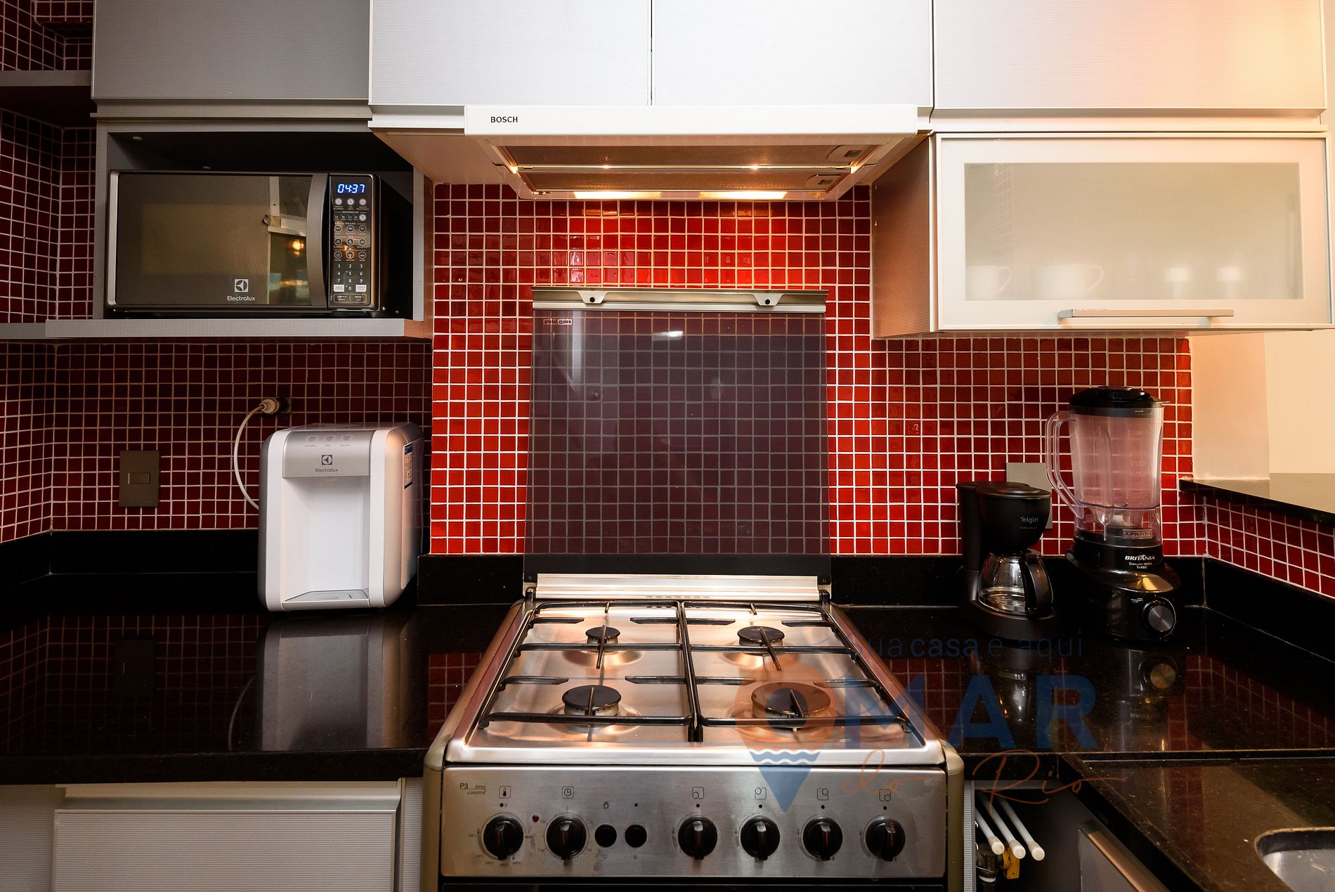 Cozinha: geladeira, fogão 4 bocas com forno, micro-ondas, purificador de água (com opções natural, fria e gelada), cafeteira elétrica, liquidificador e utensílios de cozinha.