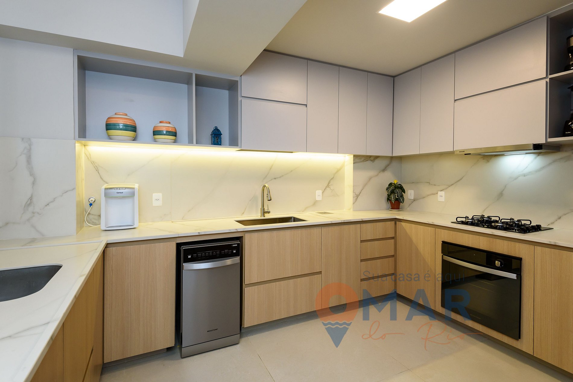 Cozinha: geladeira, cooktop 4 bocas, forno, depurador de ar, micro-ondas, lava louças, liquidificador, cafeteira elétrica, torradeira, sanduicheira, purificador de água (natural e gelada) e utensílios de cozinha.