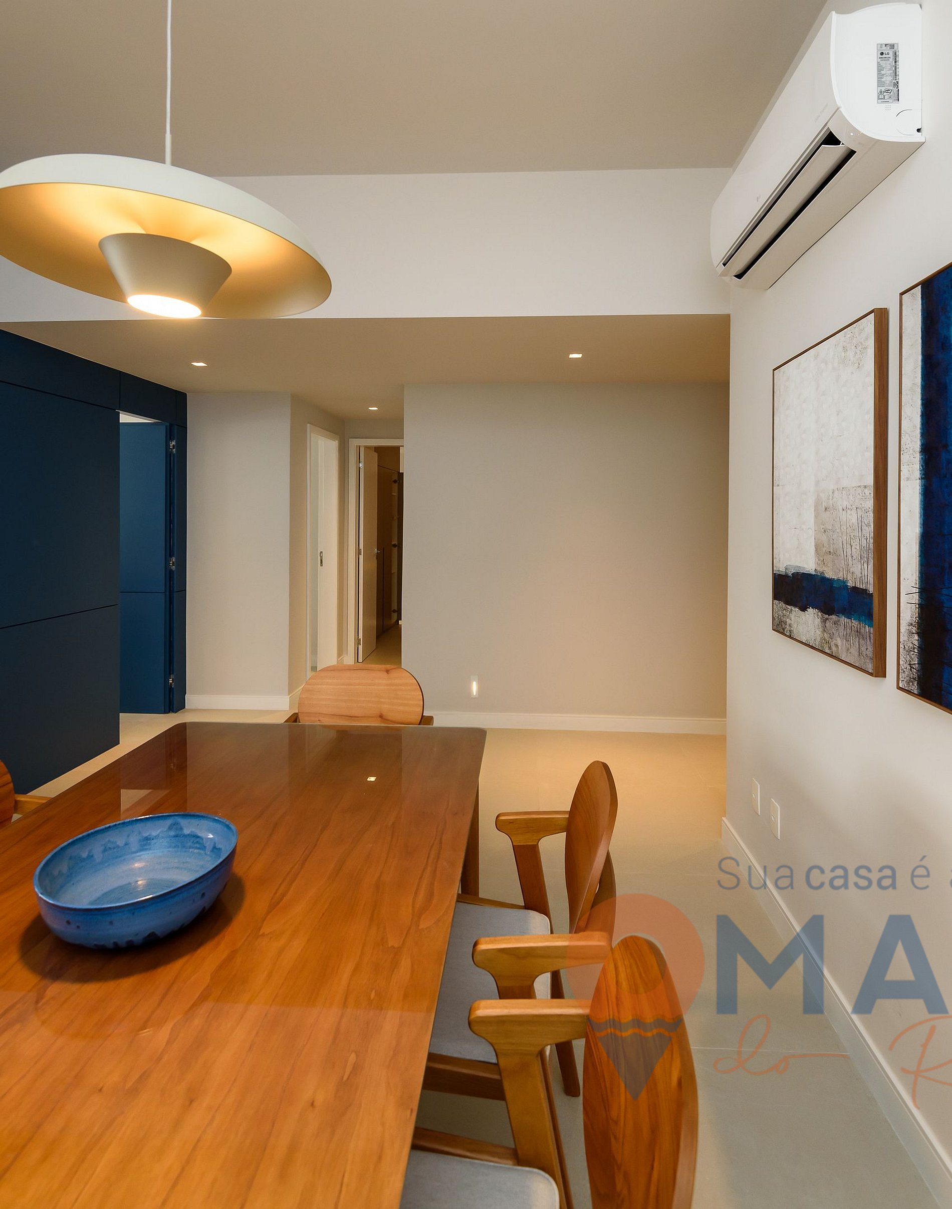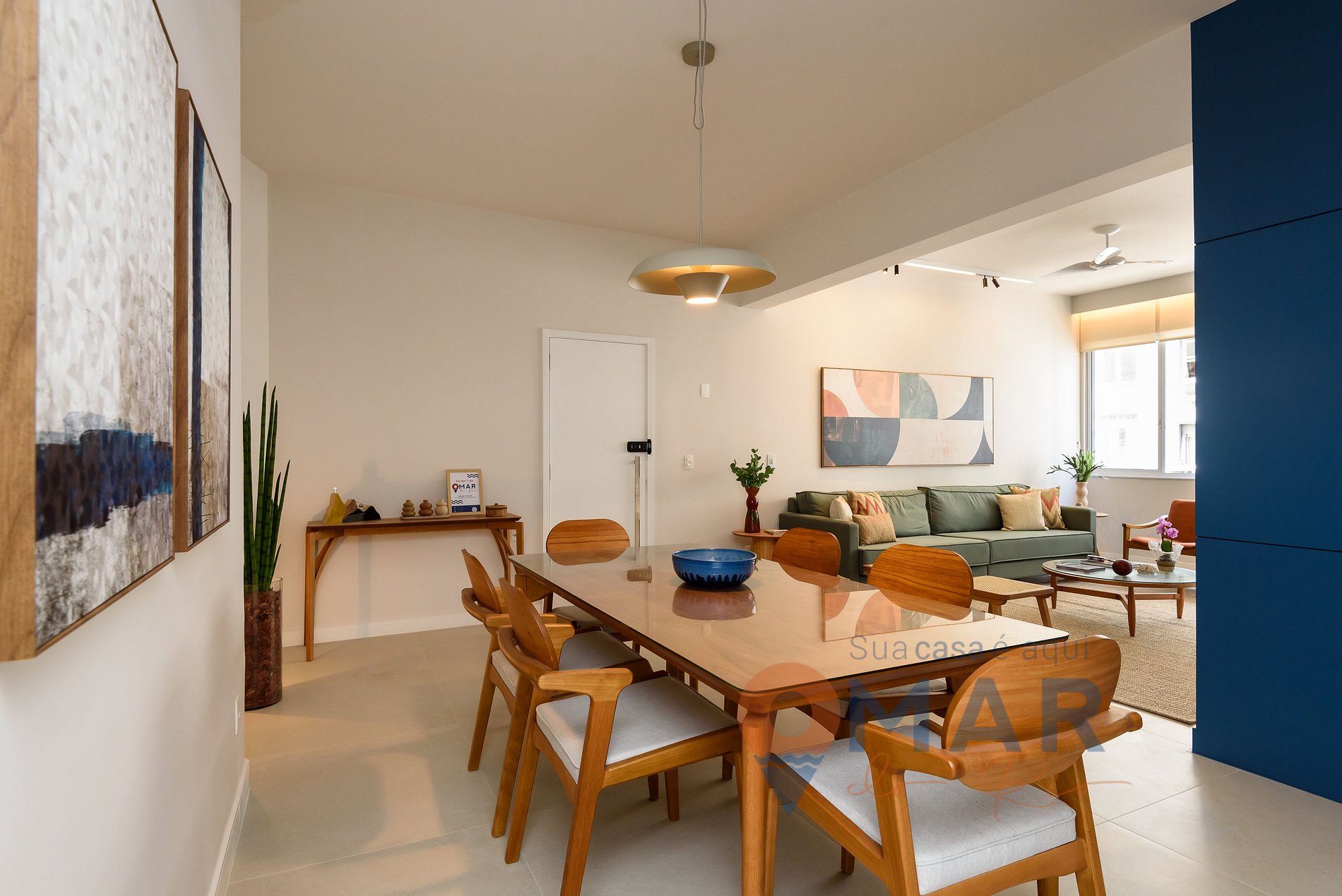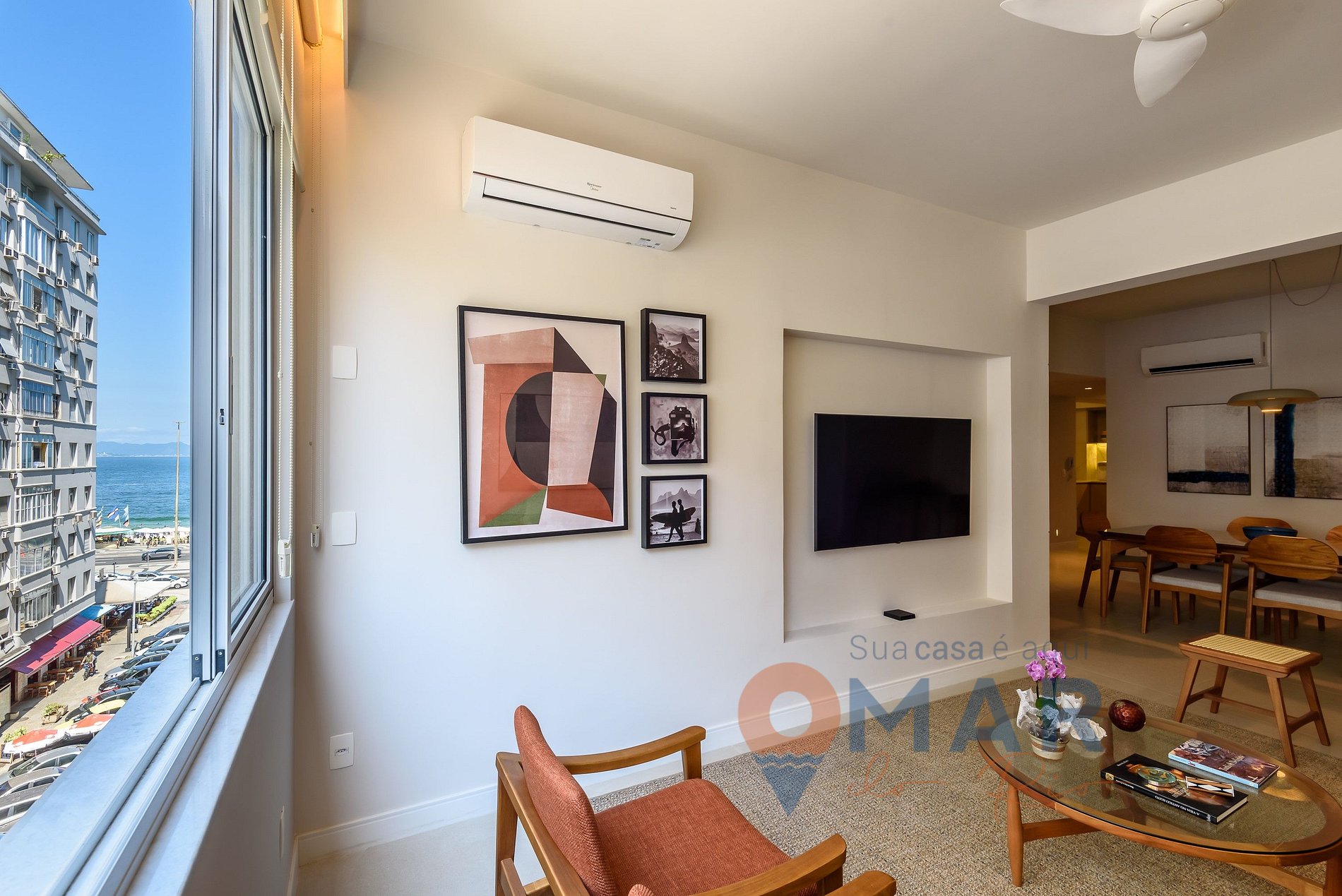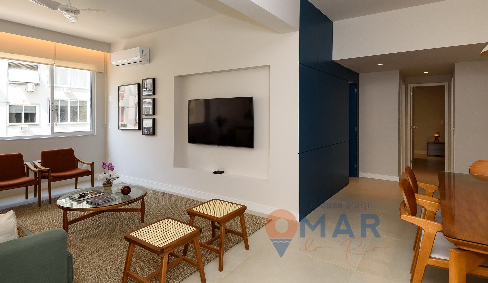 Sala: sofá, 2 poltronas, 2 banquetas, Smart TV 60" com canais a cabo (Claro TV), ar-condicionado split, ventilador de teto, persiana translúcida e mesa de jantar com 6 cadeiras.