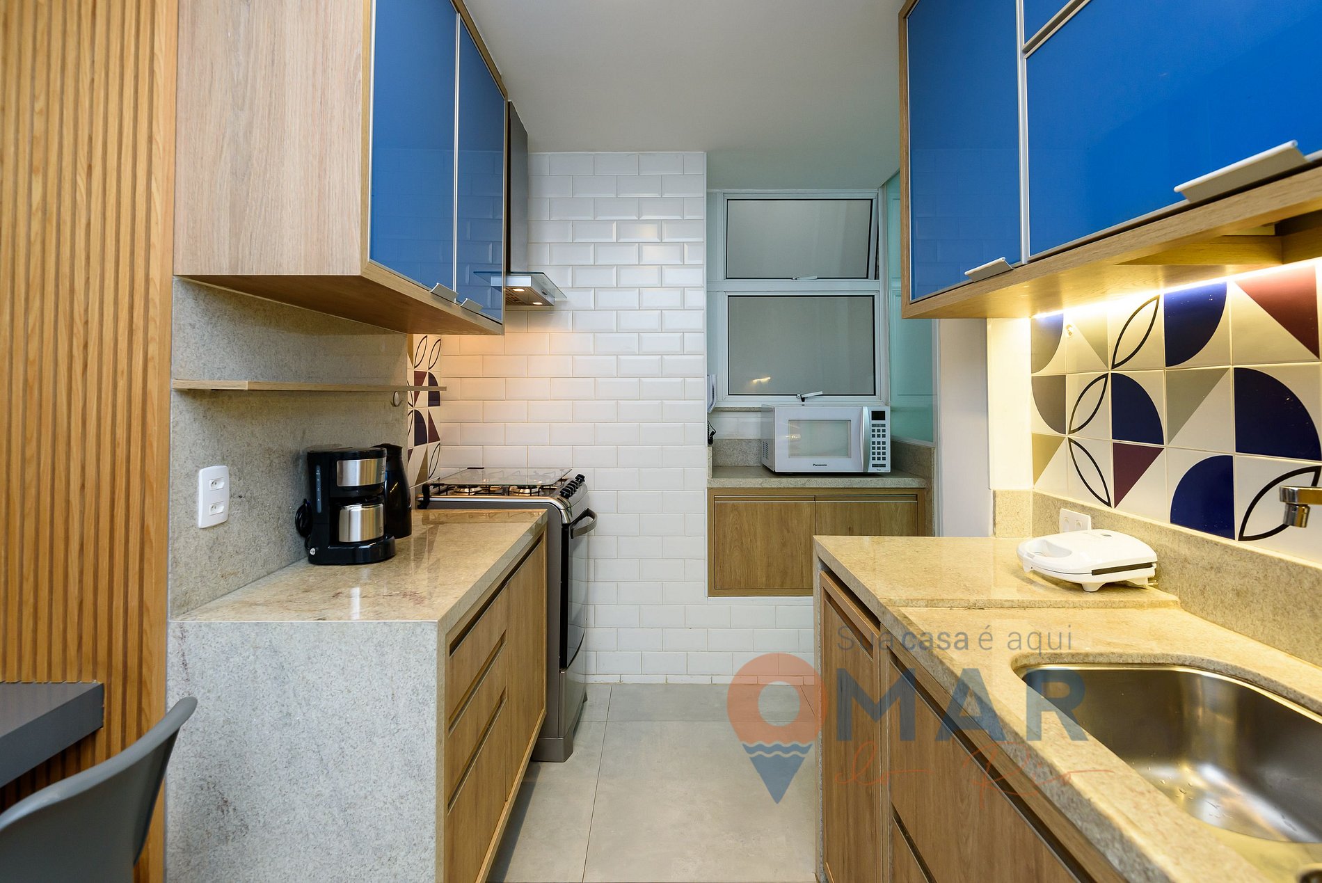 Cozinha: fogão 4 bocas, geladeira, forno, micro-ondas, cafeteira, liquidificador, sanduicheira e utensílios.