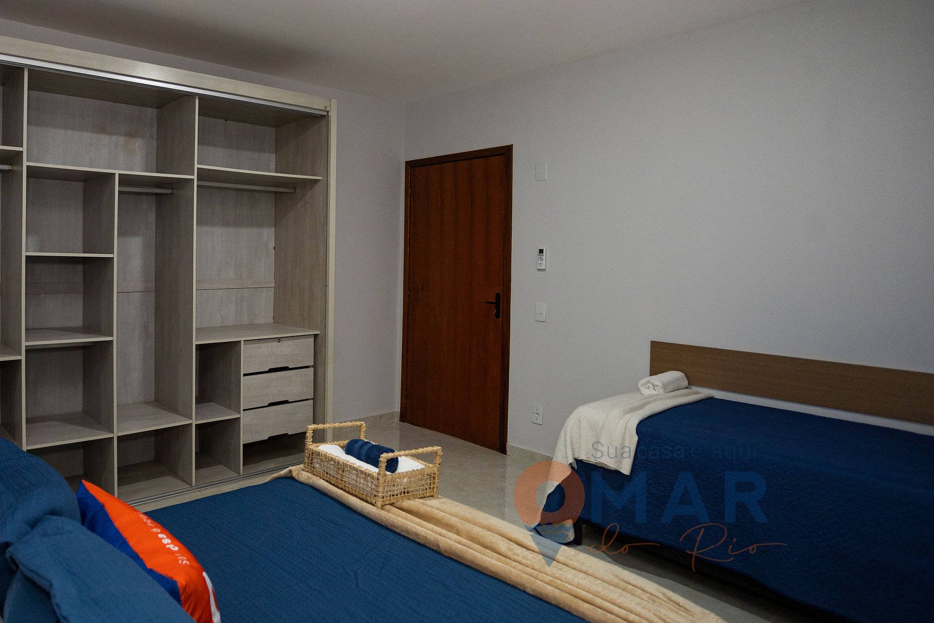 Quarto 02 (2º andar): Cama casal padrão (188cm x 138cm), cama de solteiro (188cm x 88cm), ar condicionado split.
