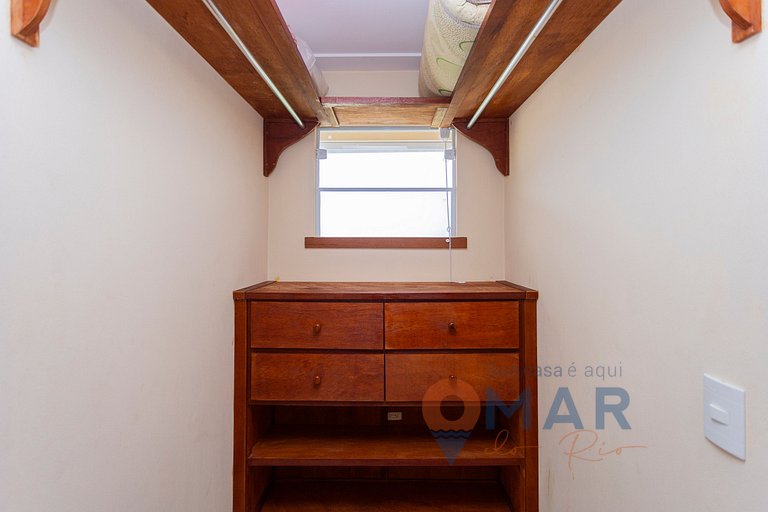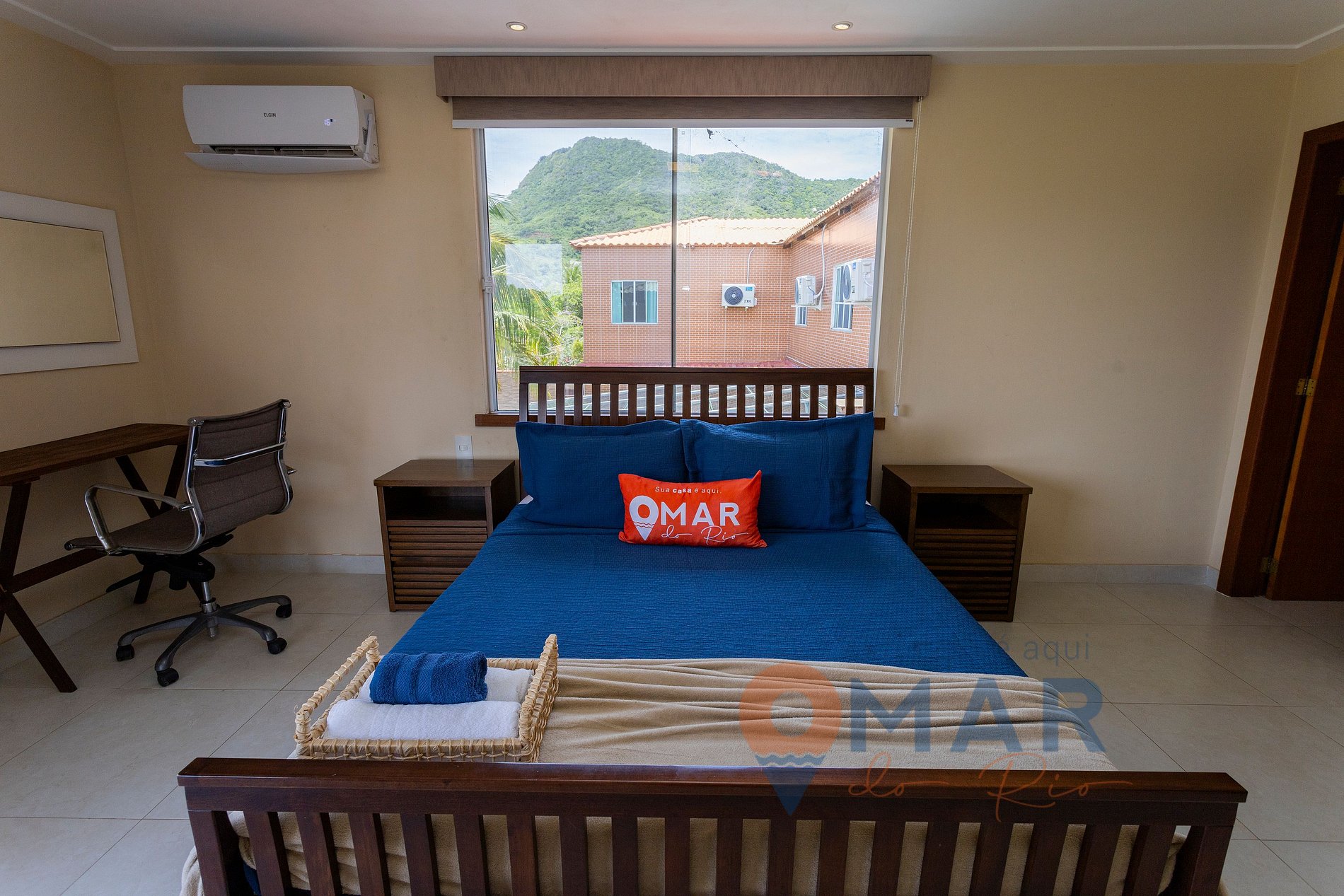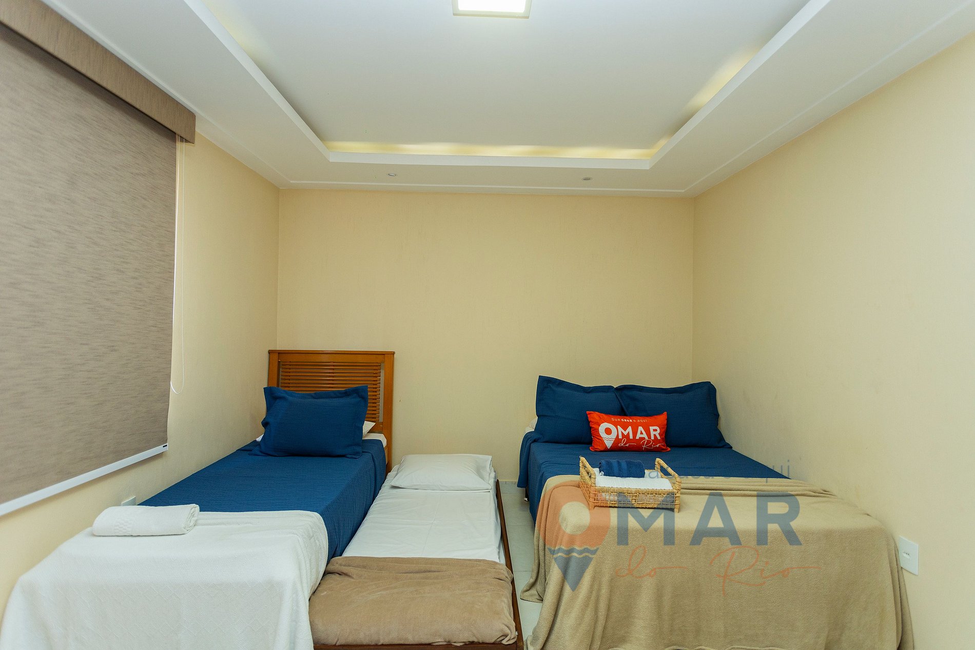 Suíte Principal (2º andar): cama Queen Size (198cm x 158cm), 2 camas auxiliares Solteiro, ar-condicionado, persiana blackout, workstation, closet, varanda e banheiro com chuveiro duplo.