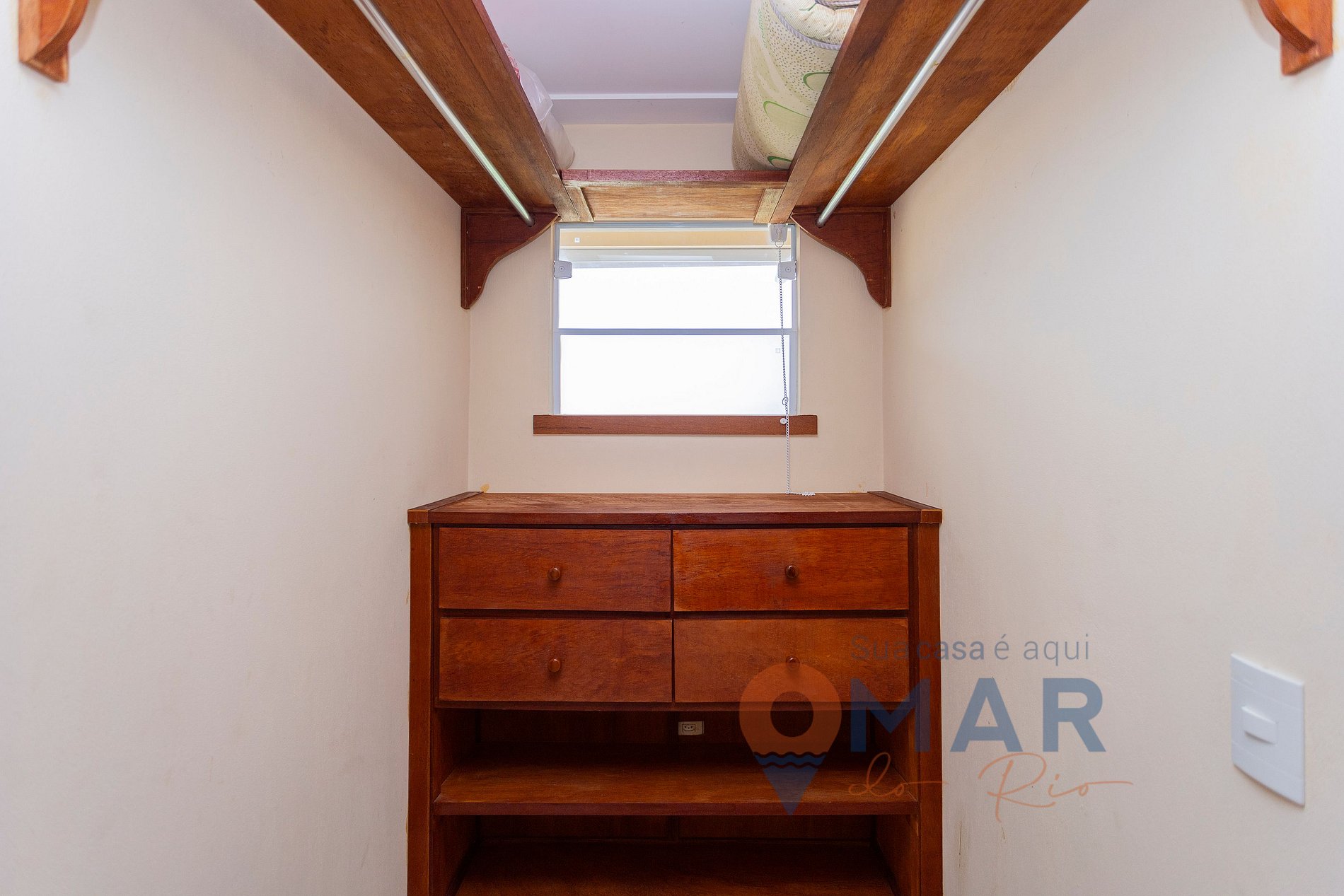 2ª Suíte (2º andar): cama casal padrão (188cm x 138cm), bicama de solteiro, ar-condicionado, persiana blackout e closet.