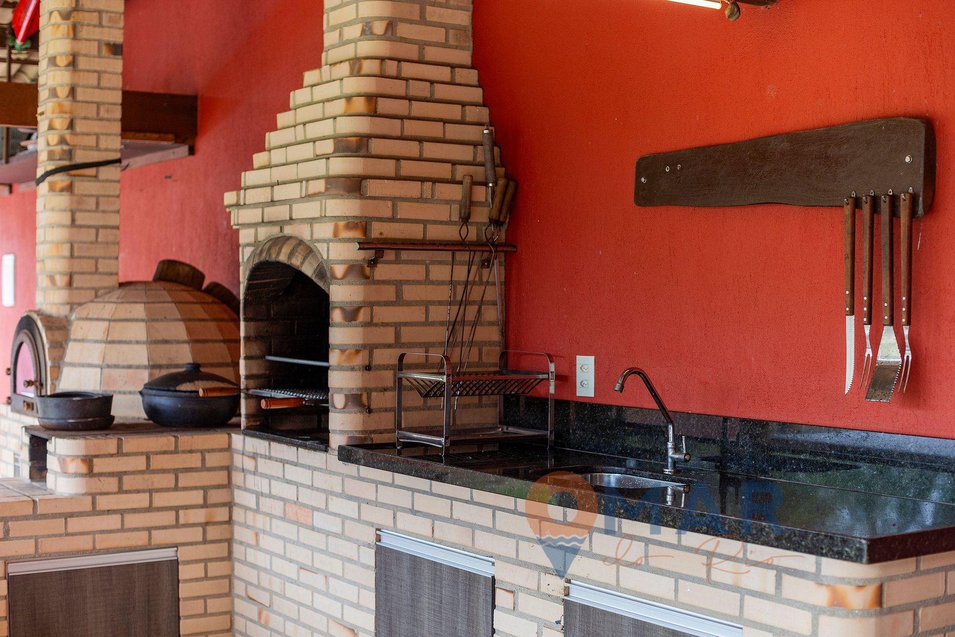 Área Gourmet: forno a lenha, churrasqueira, geladeira e mesa com cadeiras.