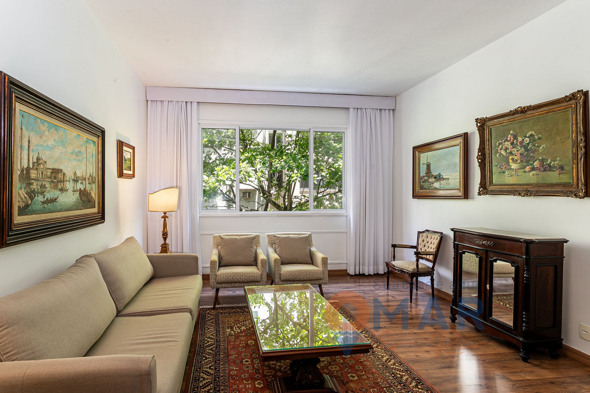 Sala de estar: Sofá, poltronas, abajures, ventilador e cortina.