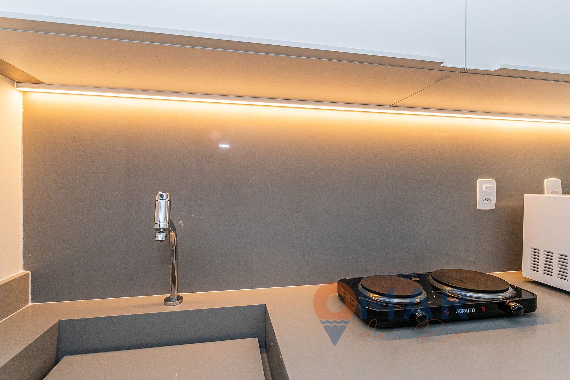 Cozinha: cooktop de indução 2 bocas, frigobar, micro-ondas, cafeteira expresso 3 corações, liquidificador e utensílios.